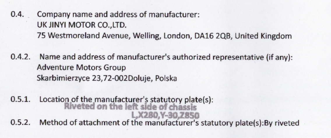 Mit Herkunftsland bin ich aktuell auch überfragt. Normalerweise bei Importen das Land wo die Ware hergestellt/gefertigt wurde. Allerdings steht In der EU Certifiation unter Hersteller: UK Jiny Motor Co LtD mit einer Adresse In England und noch eine repressentative Adresse in Polen.