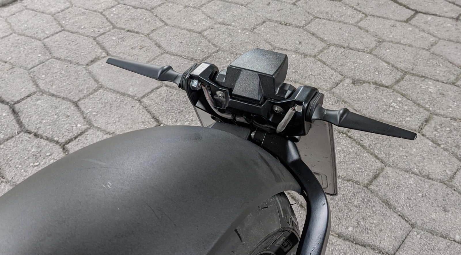 Montageänderung: mein hier beschriebener Umbau der hinteren Blinker wurde nochmal updated, und das ist wichtig, deshalb schreibe ich nochmal was dazu. Es ist keine gute Idee, die größeren (hintenliegenden) Löcher seitlich am Kennzeichenträger zu verwenden. Dort ist innen keine saubere Verschraubung möglich. Die Blinkerschäfte sind daher einem starken Biegemoment ausgesetzt, und die schiefe Verschraubung lockert sich zudem leicht. Ich habe nun die kleineren seitlichen Löcher minimal aufgebohrt von ca 7mm auf 8mm. Dort lassen sich die Blinker perfekt und plan verschrauben. Man braucht aussen zwei Distanzscheiben, damit der lange Blinkerschaft innen nicht anstösst. Sieht jetzt so aus: