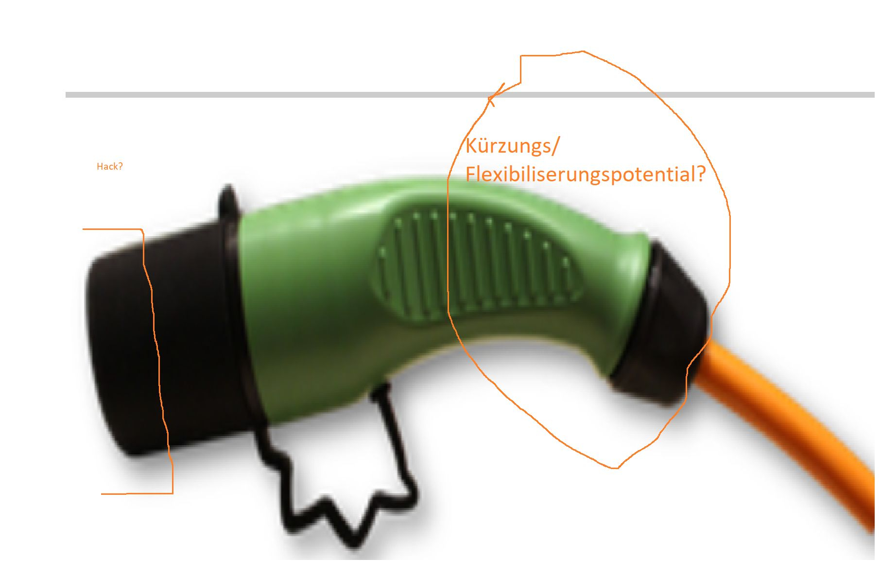 Es gibt aber einen Trick 17, mit dem für geringe Ladeleistungen (<3,6kW) eine Typ 2 Buchse vorn ausreichend gekürzt ist (das sind aber nur 12mm), so dass er auch als Verlängerung eines an die Ladestation angeschlagenen Typ 2 Ladekabels dienen kann. Die gekürzte Form kann auch direkt in die Ladestation gesteckt werden, kann dort aber nicht mehr verriegelt werden.