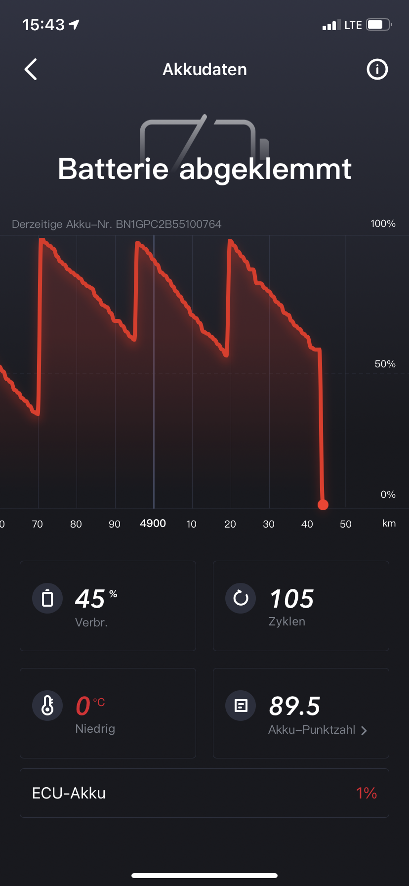 Aufgeladen im Roller wie immer, ein Akku 100 % voll der andere 0%. Fehler 192, von jetzt auf gleich tot. Aber hier gehört es nicht hin.