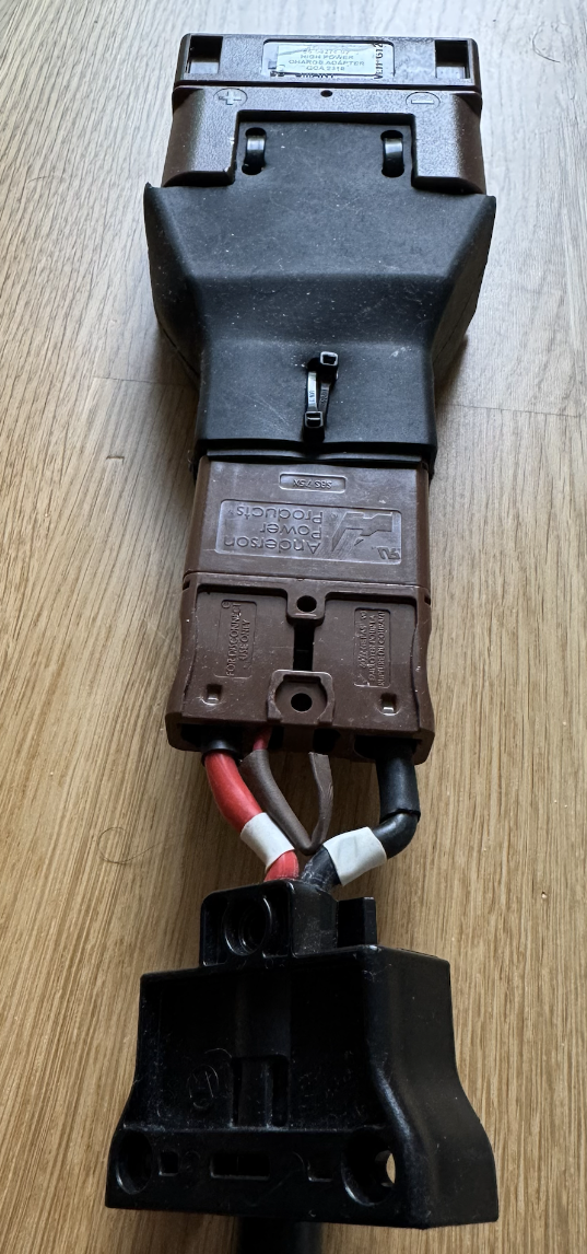 Die DC-Seite des Ladegeräts geht an den Anderson-Stecker. Wenn der Hersteller nicht total verblödet ist, sollten die Kabelfarben hier schwarz (minus) und rot (plus) sein. Aber das ist nicht zwingend vorgeschrieben wie die AC-Farben, da kann es schon vorkommen dass auch für DC Kabel die für 230V vorgesehen waren verwendet werden, wenn der Hersteller unbedingt ein paar Cent einsparen will.