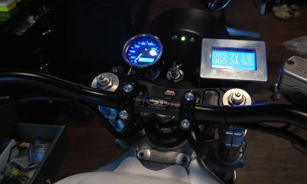 Hat ne Weile gedauert, das BMS-Dsiplay in eine schöneres Gehäuse zu bauen. Ein wenig klobig neben dem runden Daytona-Tacho. Hab dann eine Modem-Kabel Verlängerung hergenommen. Das schöne dabei ist, dass der Hall-Ausgang des Kelly sowohl das Display also auch den Tacho versorgt, so war kein extra Geber am Rad nötig.