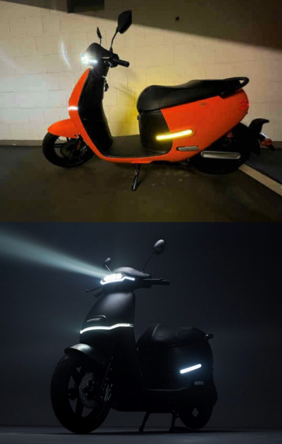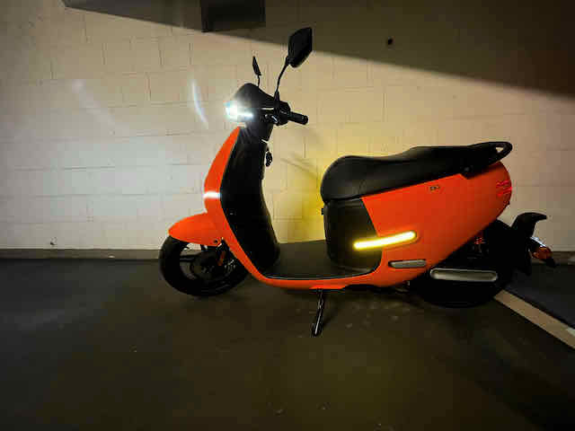 Andererseits hast du mit der aufgeklebten orangefarbenen Folie zwar ein stimmiges Design zu deinem orangefarbenen Roller, jedoch stört im Gesamtdesign der Kontrast zu den weißen Lampen vorne. Die Vorderlampen müsstest du meiner Meinung nach vorne auch noch mit Orangefarbene Folie ausstatten - eventuell sogar auch die Hauptlampe (sofern das geht). Dann wäre das Designkonzept insgesamt stimmig.