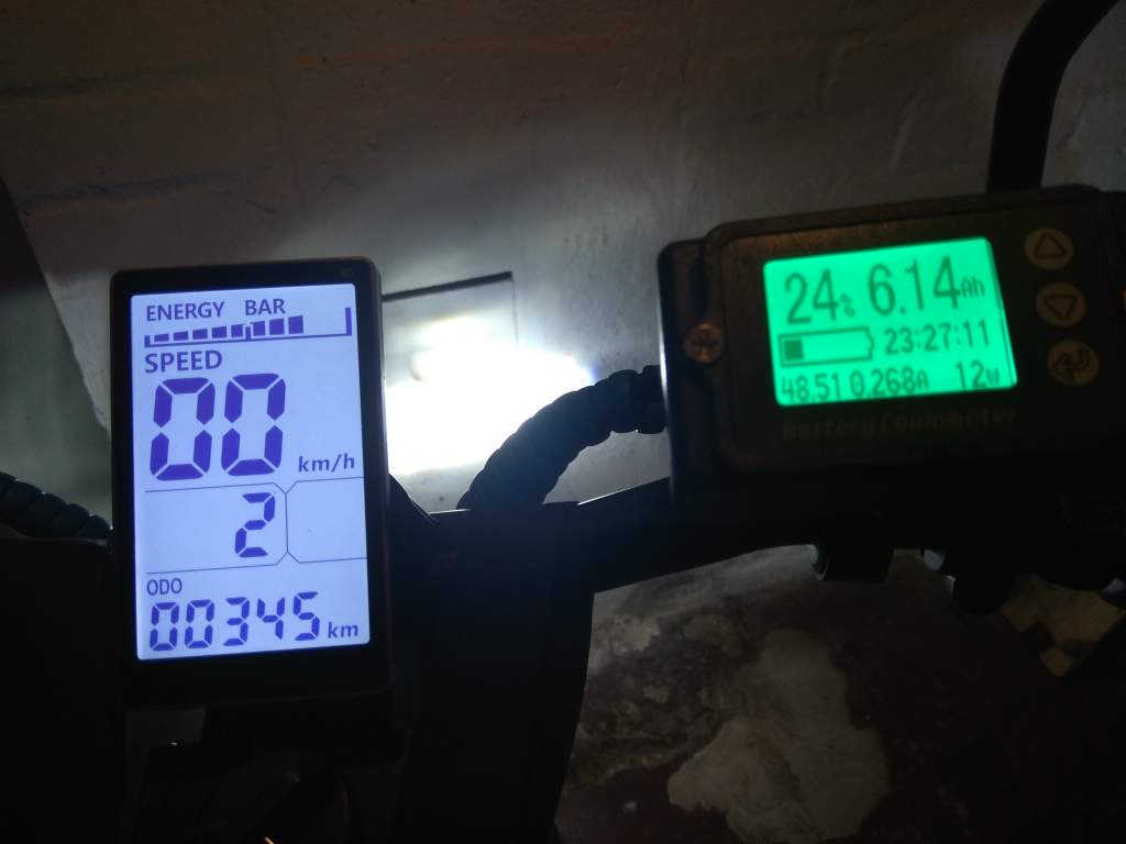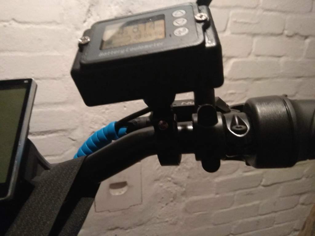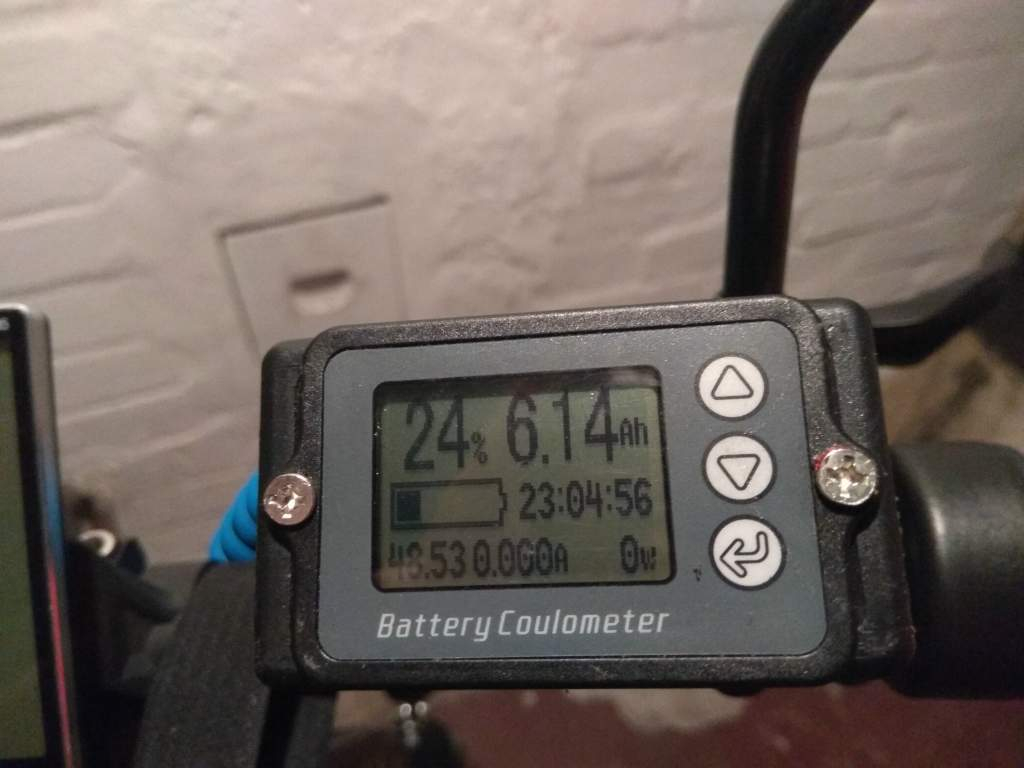 heute kam endlich für das coulometer das verlängerungskabel, dass zu kurze originalkabel wieder raus und die verlängerung rein. so konnte ich auch die schon vorbereitete halterung für das coulometer angeschraubt werden. passt und alles gut im blick. am späten nachmittags dann mal ne größere runde gedreht um zu sehen wie der verbauch ausschaut und wie sich das coulometer macht. muss sagen haut sehr gut hin, richtig guten überblick über den akkuverbrauch und auch die leistungsaufnahme. die angezeigten werte scheinen sehr plausibel zu sein. interessant ist vor allem die amperezahl die der motor zieht. konnte beobachten das bis zu 27,8 ampere gezogen werden beim anfahren oder wenn es bergauf geht. der controller leistet bis zu 30 ampere. also sollte das alles passen.
