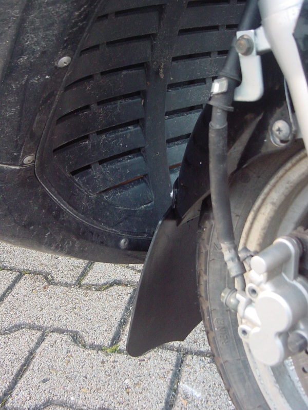 Tja, so wie es aussieht kann ich mich während der Fahrt auch nicht ansatzweise so sehr verrenken, dass ich ans Hinterende meines Vorderrads sehen würde. Das Beinschlid ist so ausladend, dass es alles da vorn sehr gründlich verdeckt. So wird es wohl ein Geheimnis bleiben, ob der Spritzlappen bei Vmax wild flattert oder nicht