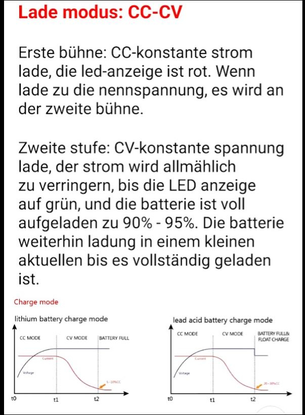 Falsche Aussage habe ich geprüft, das heißt Spannung und Strom gemessen. Wer den Akku optimal geladen haben will, sollte nach Aufleuchten der grünen LED das Gerät noch 1-2 Std weiter laden lassen. Der Strom reduziert sich allmählich bis auf 1/10tel. Siehe Foto ... chinesische Übersetzung