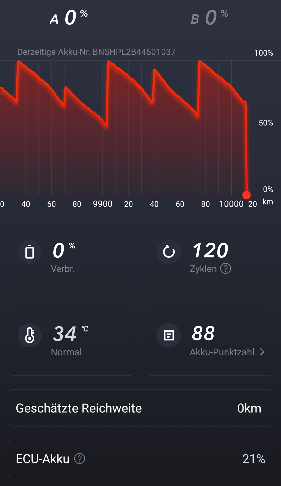 Ich versuche aber soweit wie möglich den Akku zu schonen und im mittleren Bereich (z.B. 20-80 %) zu halten, was aber nicht immer gelungen ist, einmal musste ich im Winter auf 0% + weitere 5 km fahren bis der Roller aus ging. Trotzdem ist die Akku-Reichweite mit aktuell 40 km für mich noch für vieles ausreichend. Im Neuzustand war die Akku-Reichweite ca. 60 km.