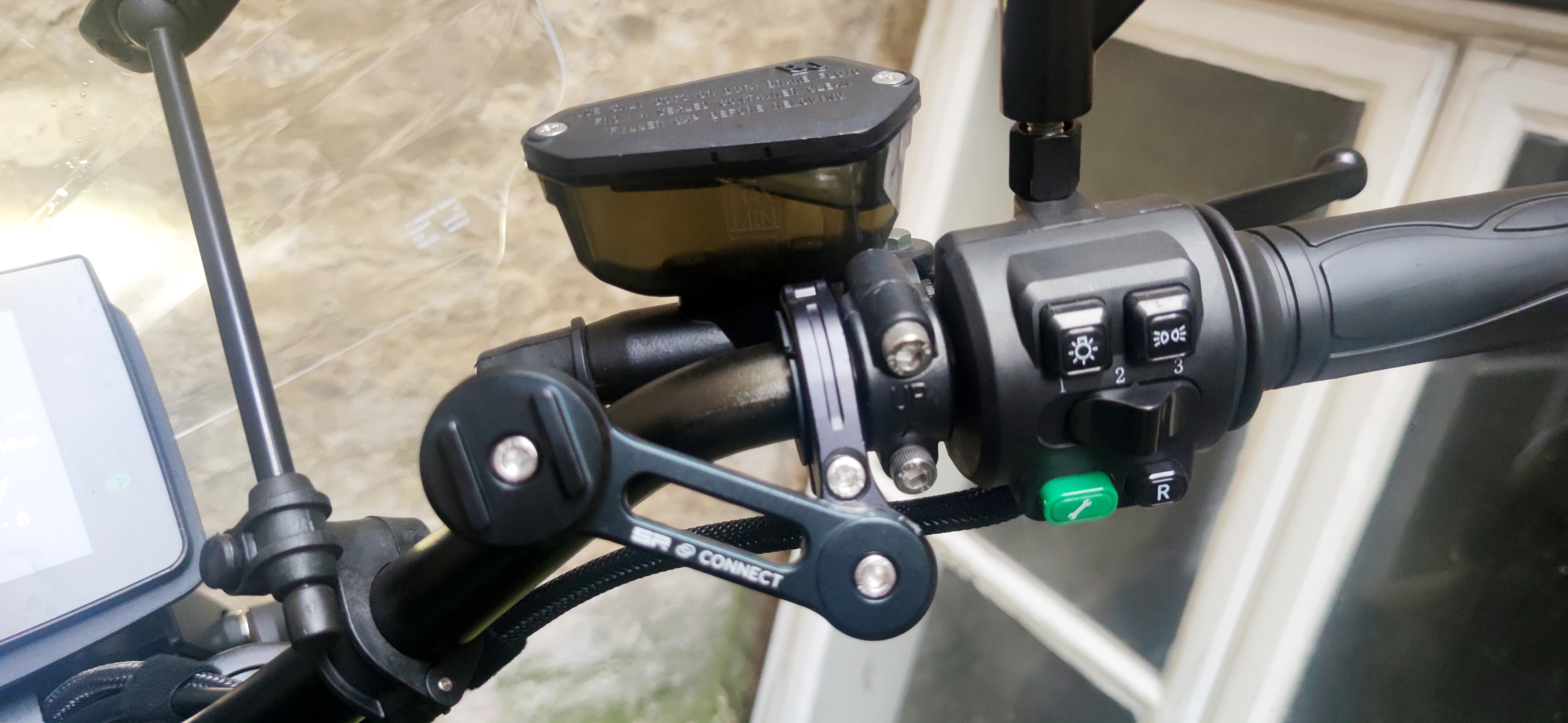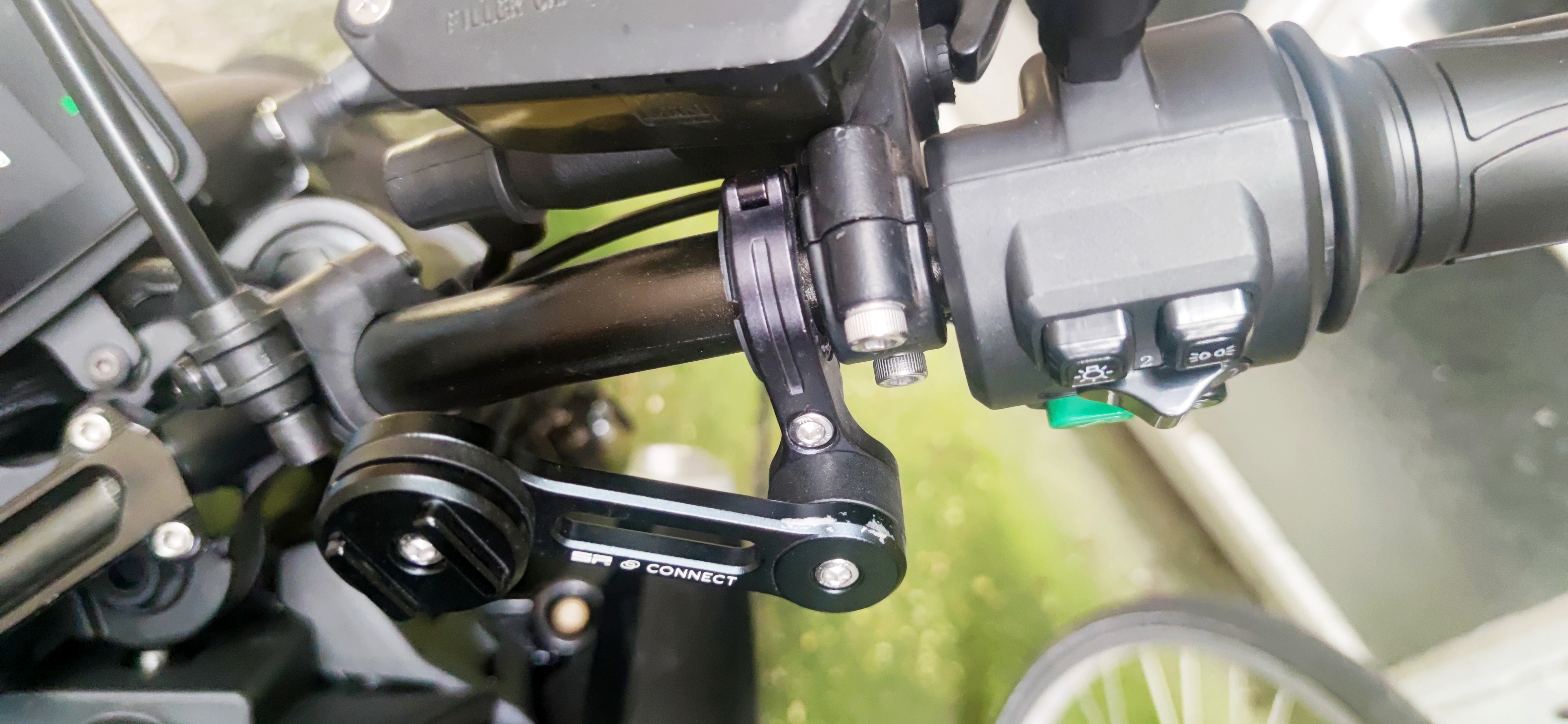 Ich nutze von SP-Connect den “Bar Clamp Mount Pro“. Aus Flugzeug-Aluminium, wird direkt mit der Lenkerklemme verschraubt und sitzt dadurch bombenfest. Alles individuell einstellbar.