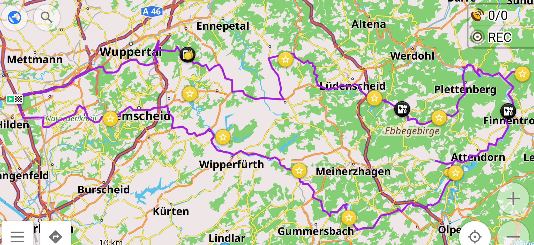 Vorbereitung mittels GoogleMaps (aber dort nur 10 Wegepunkte möglich, also erst mal nur zum abchecken möglicher sinnvoller Routen), dann mit ABetterRoutePlanner. Dabei schälten sich zwei Zwischenladestopps heraus, im Süden erst mal in Gummersbach-Becke für berechnete 40 Minuten, dann in Herscheid am am Alten Schulplatz für weitere 24 Minuten: