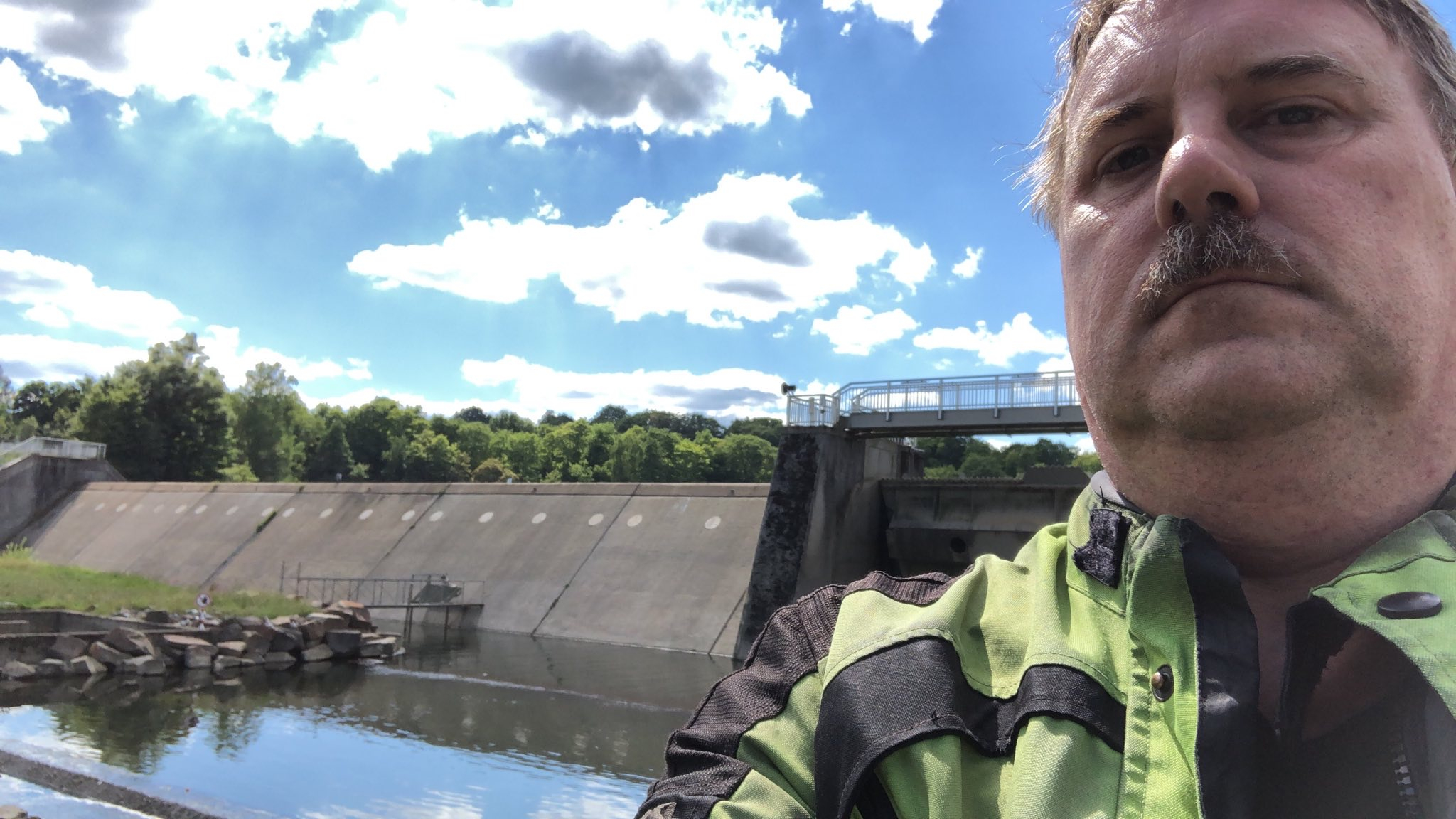 Dann bog ich nach Norden ab, die zwei letzten Nebenziel abzugrasen, erst über die Porta Westfalica, dann durch verwinkelte Gässchen von Beyenburg, um an den Fuß der dortigen Wupper-Staumauer zu gelangen. Doch auch hier Einfahrt verboten, und der Alternativweg endet als Fußweg entlang der Wupper. Da ich noch gut in der Zeit war habe ich die Zero abgestellt und bin die letzten 140m zu Fuß gelaufen. Ein Beweisbild habe ich dort gemacht: