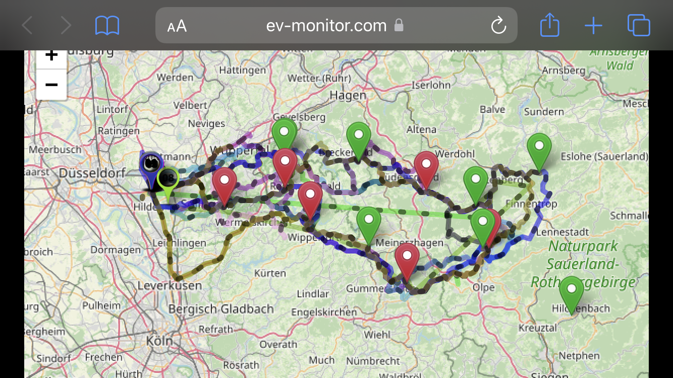 Das war meine Strecke, an den schwarzen Markern habe ich geladen. Einmal 15min und zweimal 25min. Beim letzten Halt in Finnentrop gab es dazu noch ein leckeres Eis + Limo 8-)