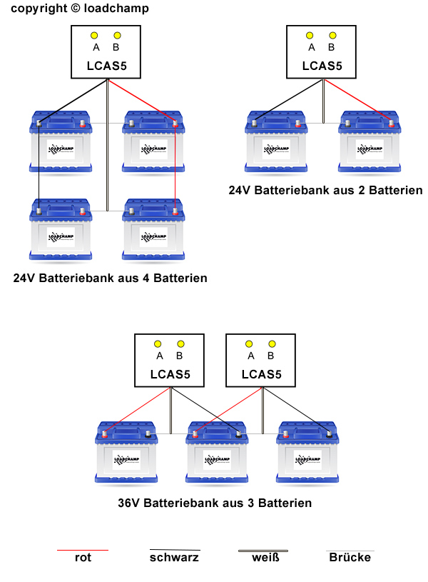 Aus einem Loadchamp kommen 3 cables. Ein loadchamp muß immer zwischen 2 nebeneinanderliegenden Batterien angeschlossen werden. Allerdings, die Anordnung der Batterien im Roller bleibt dir überlassen. Vielleicht eine schlechte, eine gute, eine schlechte, eine gute.......