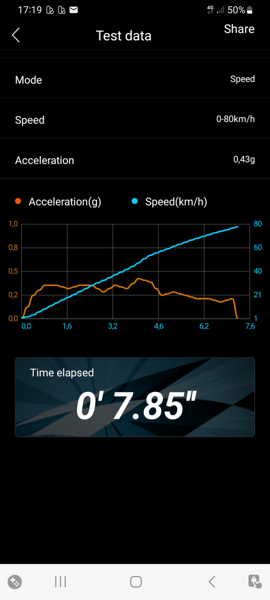 Selbst wenn es nur 2 Sekunden bis echte 50 beim FW6 sind, wäre das schon top und ich bin trotz >20kW Leistungsaufnahme aus dem Akku mit 4 Sekunden bis GPS 50 und 8 Sekunden bis GPS 80 immer noch Meilenweit davon weg. Mein Roller ist aber auch deutlich schwerer und zudem hat der Controller beim beschleunigen spürbar eingegriffen und den Phasenstrom kurzzeitig gedrosselt. Wenn ich das noch in den Griff kriege sind vielleicht auch 7 Sekunden bis 80 drin.
