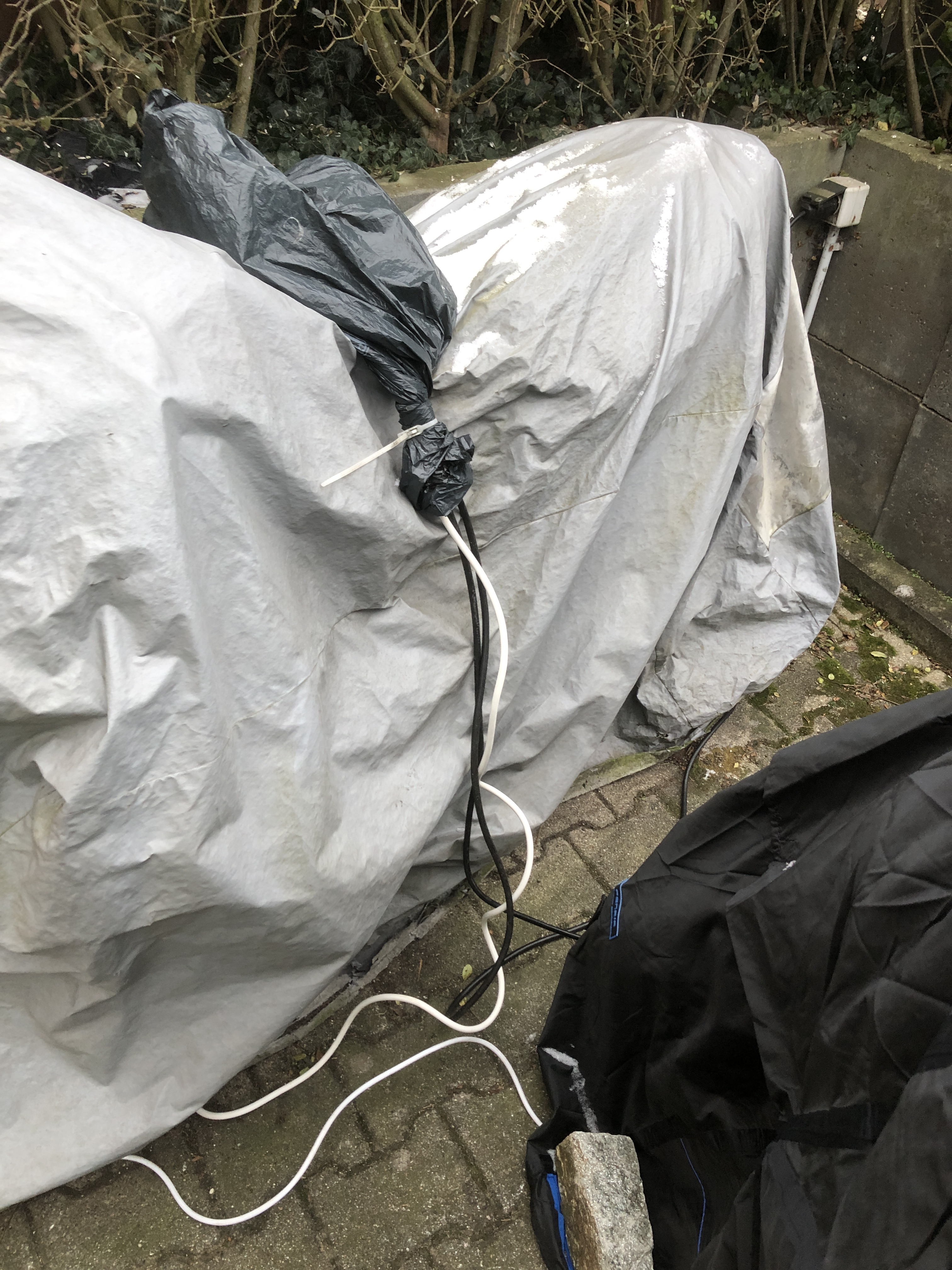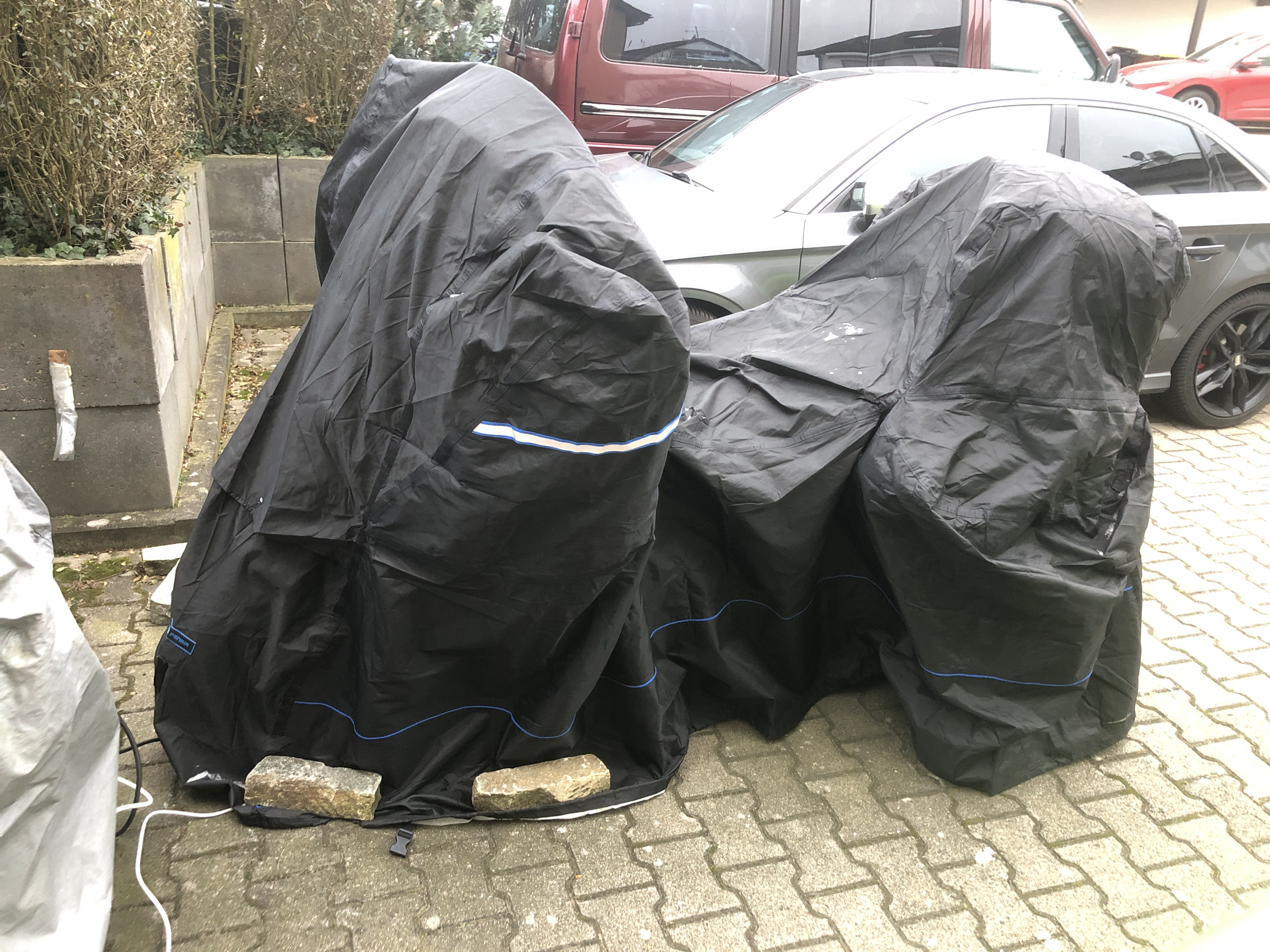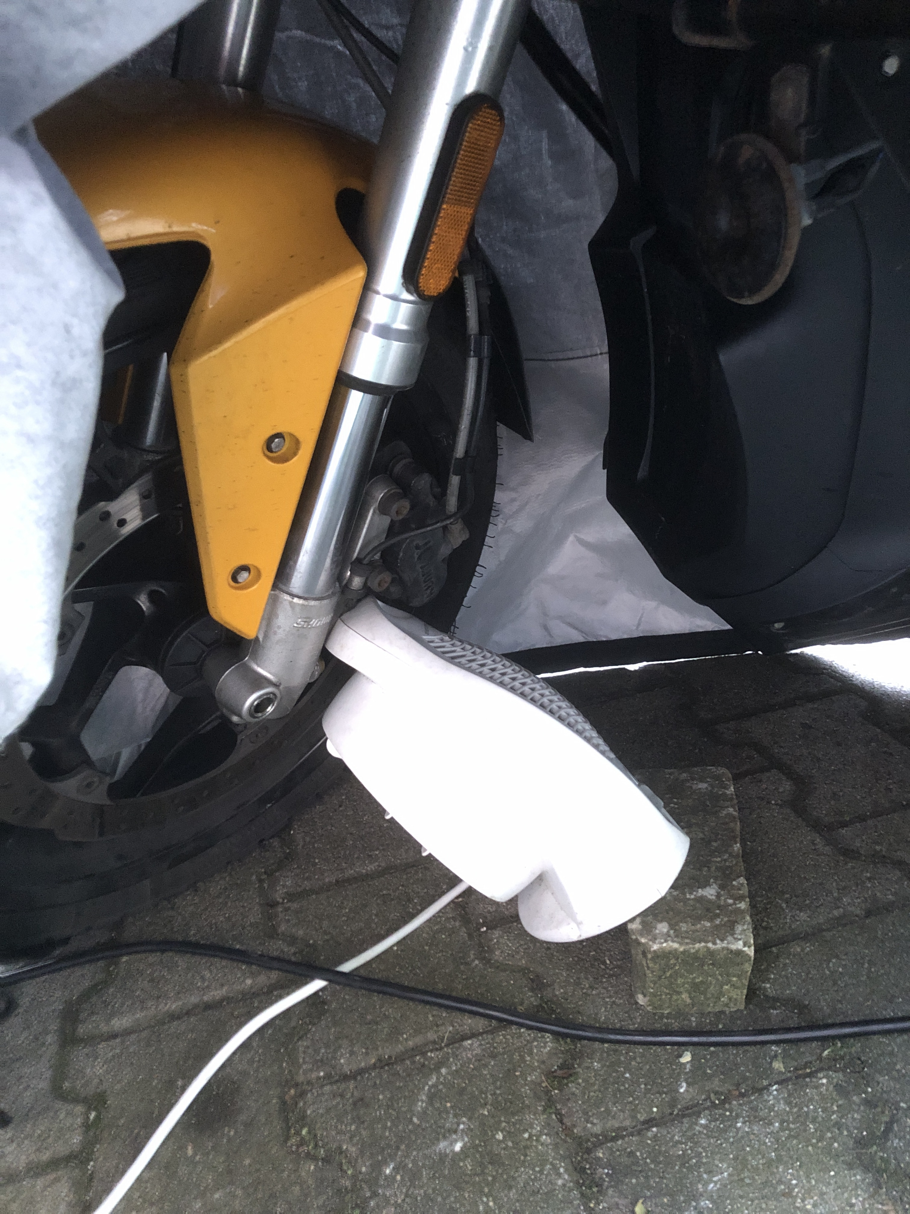 PS: Heizlüfter nur auf Stufe 1, ca. 1,6kW, Thermostat eingestellt auf ca. 20°C, er läuft daher nach ca. 20 Minuten nur sporadisch. Solide zwischen Vorderbremse, Boden und mit dem Pflasterstein gründlich eingekeilt. Das Motorrad dabei mit einem weiteren Pflasterstein unter dem Unterfahrschutz von rechts gegen Umblasen gesichert bei eventuellem Sturm.