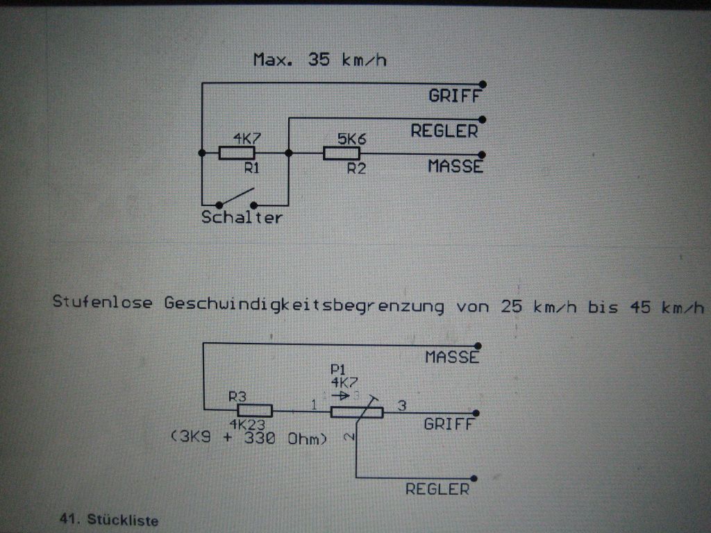 Joehannes, probiere es mal aus für uns. Ist ja schnell gelötet, und wenn man den Lötkolben nicht als Lockenwickler mißbraucht, kann dabei auch nichts kaputt gehen. Die große Unbekannte ist halt, ob der Hallsensor bei derart reduzierter Eingangsspannung überhaupt noch reagiert und wenn ja, ob die Regelbarkeit dann besser am Griff wird.