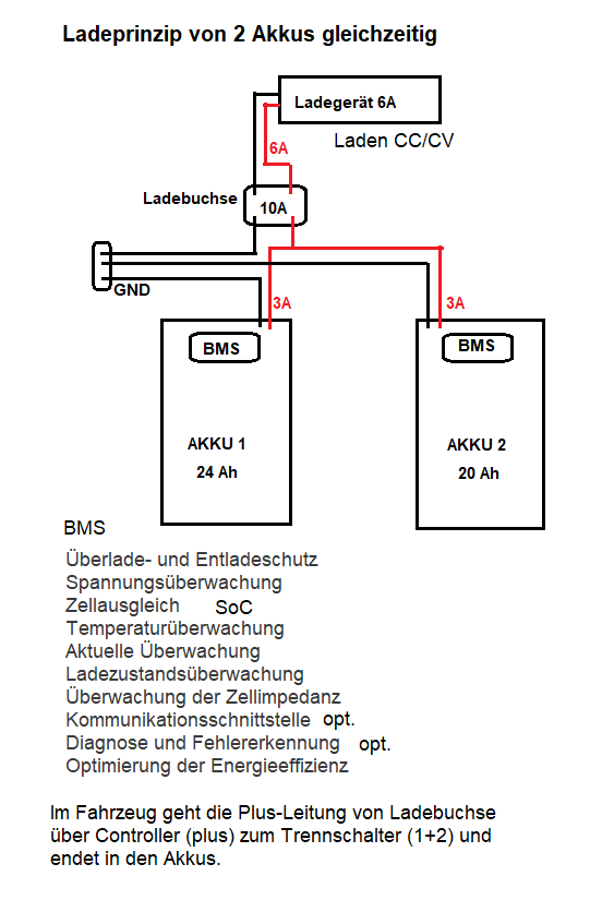 Auch in meiner Zero entladen UND laden beide extrem unterschiedlich großen Akkus gemeinsam, doch die haben beide ein BMS, und können sich über je einen Schütz zu oder abschalten. Letzteres fällt bei deiner manuellen und nur teilweise oder garnicht von einem BMS überwachten Lösung natürlich flach, sprich Du müsstest das selbst überwachen...