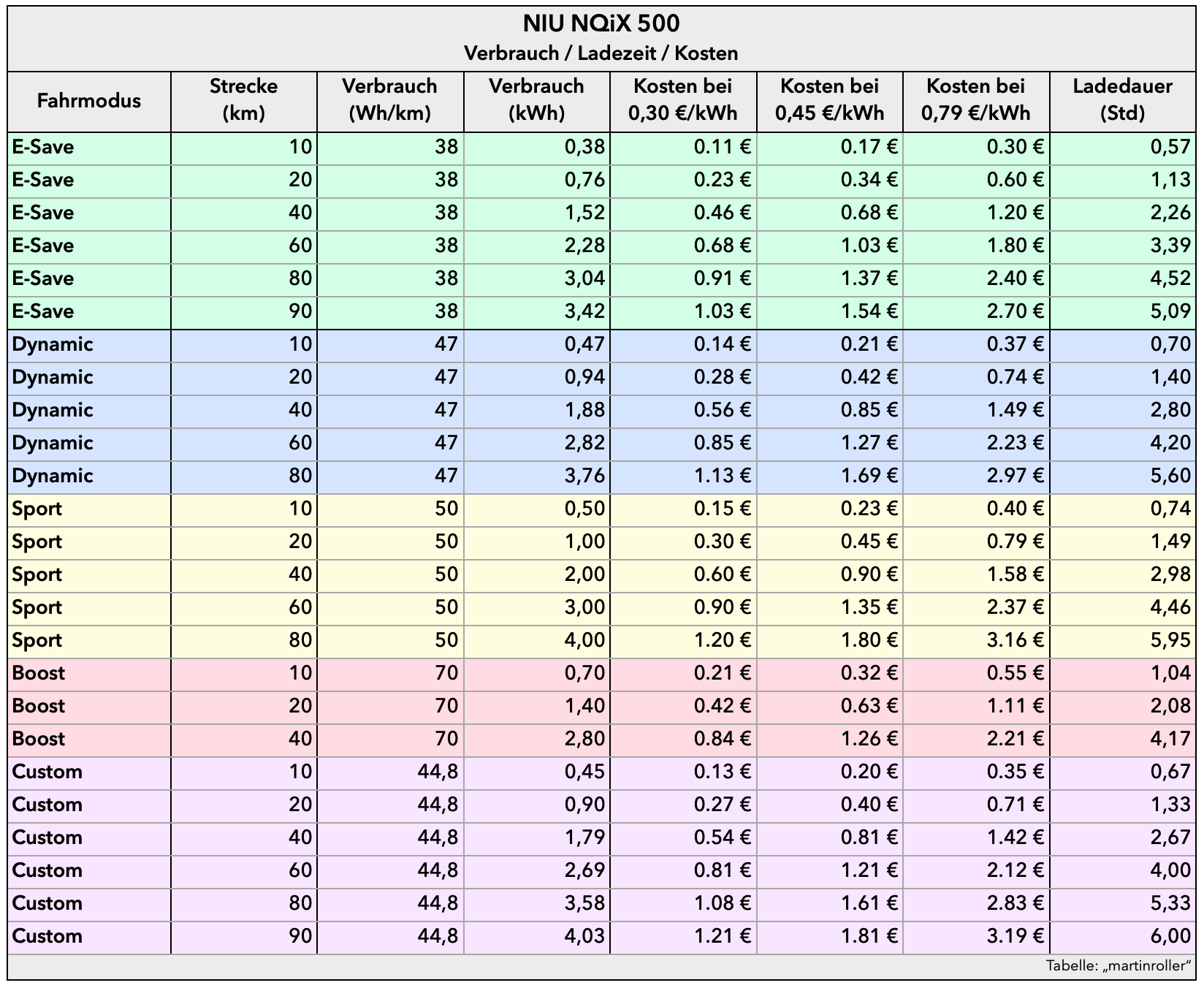 rollingmartin hat geschrieben: Sa 24. Mai 2025, 17:44 So, ich habe mich mal an einer Tabelle mit "Verbrauch, Ladezeit, Kosten" für den NIU NQiX 500 versucht. Beachte: Ich bin totaler E-Roller und E-Anfänger. Mich würde sehr ein Feedback der Profis interessieren. Machen die Werte Sinn?