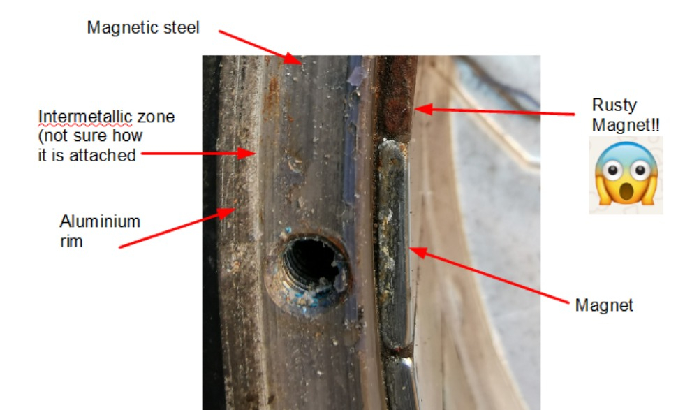 It's the best bit of quality engineering in the motor/rim. It has been accurately done and it is almost seamless between the steel and aluminium. That is tricky because the aluminium has a much lower heat coefficient, so I am not sure how they did that. They must have cooled the steel and used a press to push it in, I suppose?