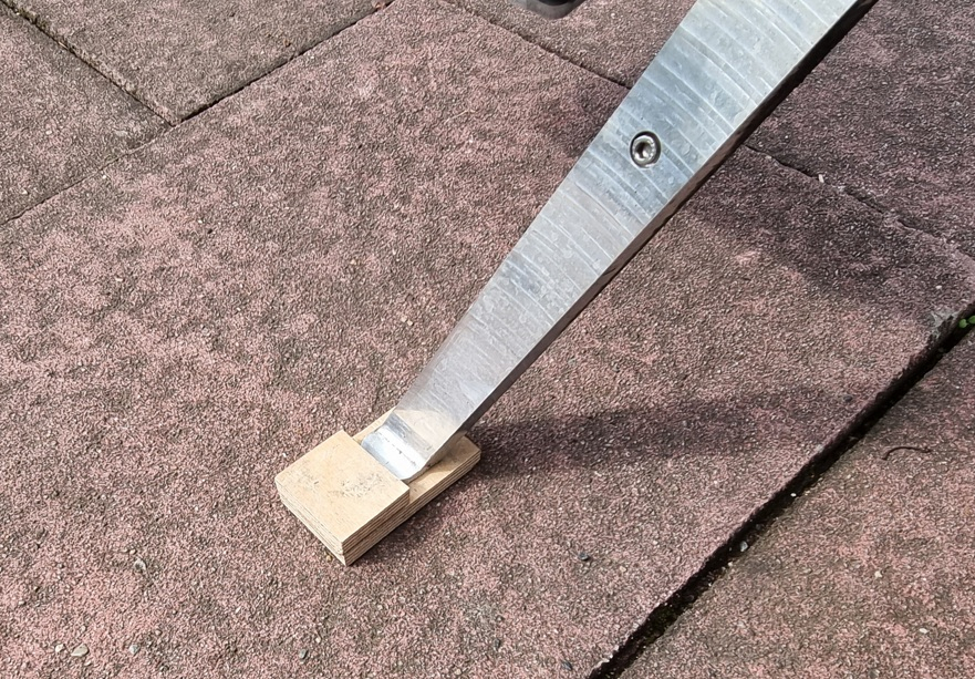 Da das weiche Alu des Ständers mit der Zeit auf Asphalt leidet, überlege ich, ein "Verlängerungs & Unterleg-holz" fest am Ständer zu befestigen, ihn dauerhaft zu verlängern.