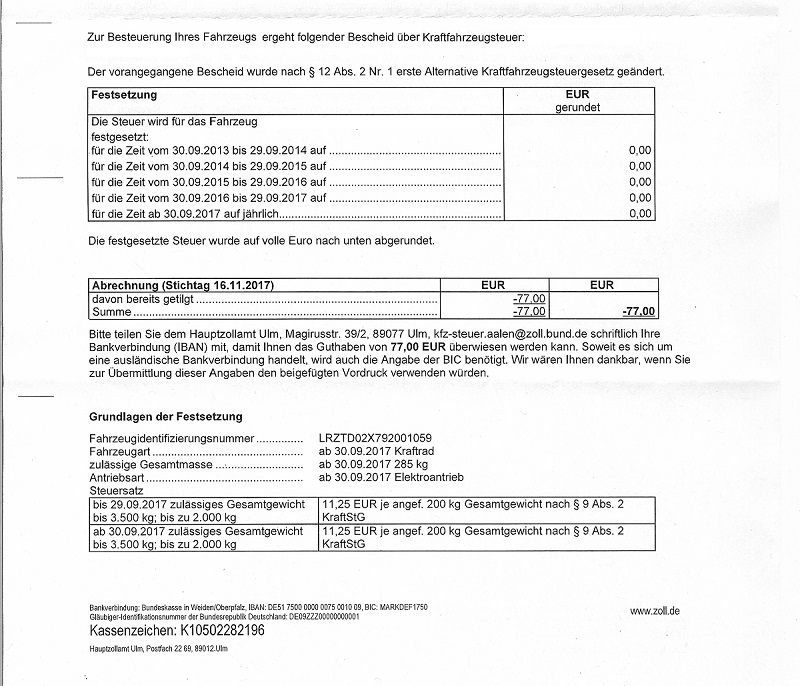 Heute lag Post vom Landratsamt in meinem Briefkasten, dass das Hauptzollamt mein Fahrzeug nun als "Leichtkraftrad" einstuft und es somit "von der KFZ-Steuer befreit" sei. Ich solle meinen Fahrzeugschein zwecks Umschreibung zukommen lassen.