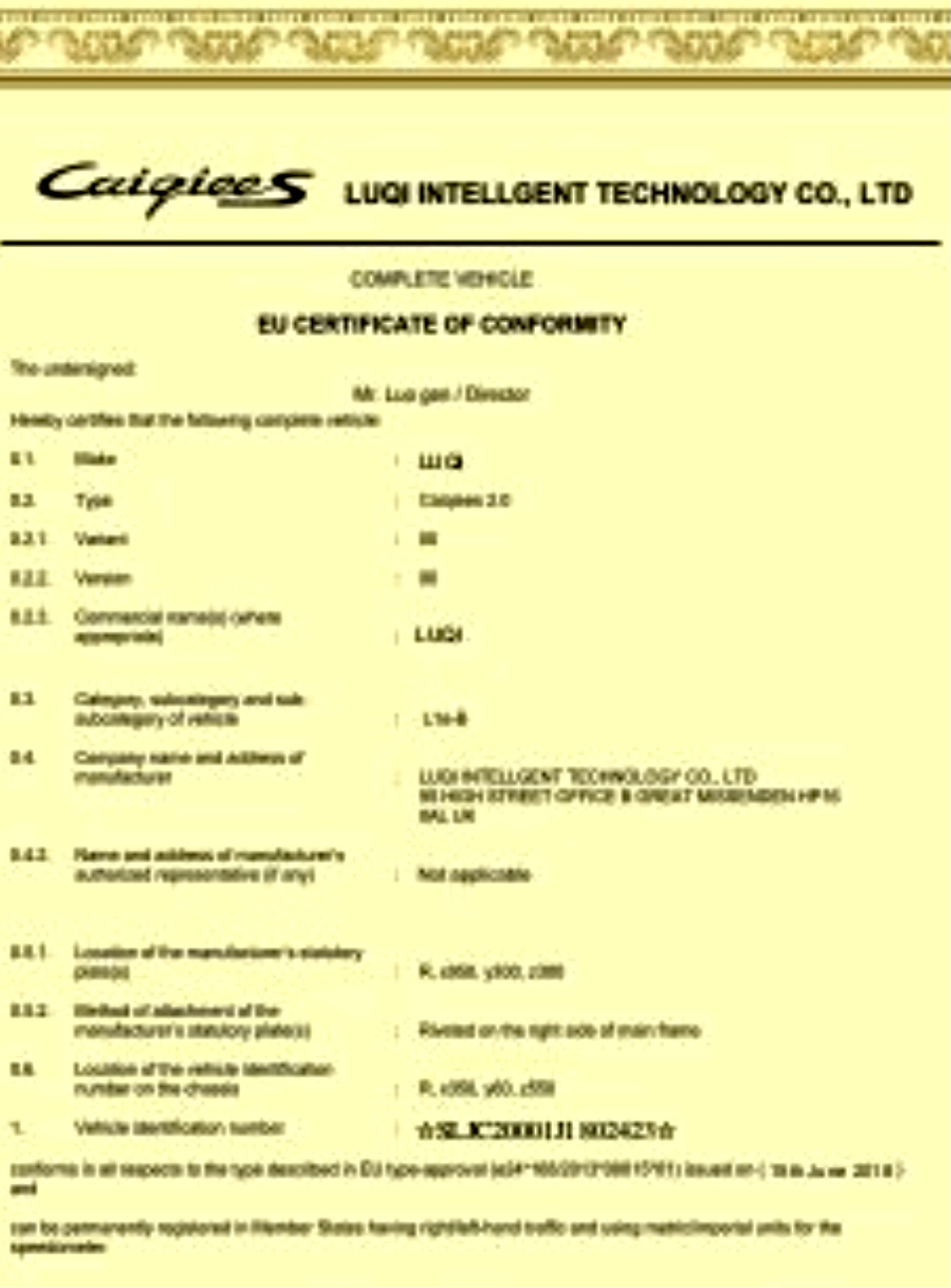 Der Hersteller ist Luqi Intelligent Blabla aber auf dem Typenschild und dem COC stehlt Luqi Intellgent Blabla.