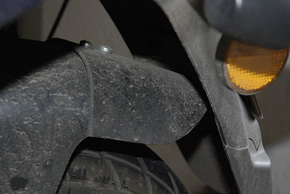 Nach der ersten Regenfahrt mit nasser Straße hatte ich erste Probleme. Denn wie sich zumindest bei unseren Modellen herausstellte, ist das innere Schutzblech (Kunststoff) zu kurz geraten. Deshalb spritzt das Wasser bis in die unter dem Sattel befindliche Elektronik und verursacht Störungen und vorzeitige Korrosionen an den Kontakten.
