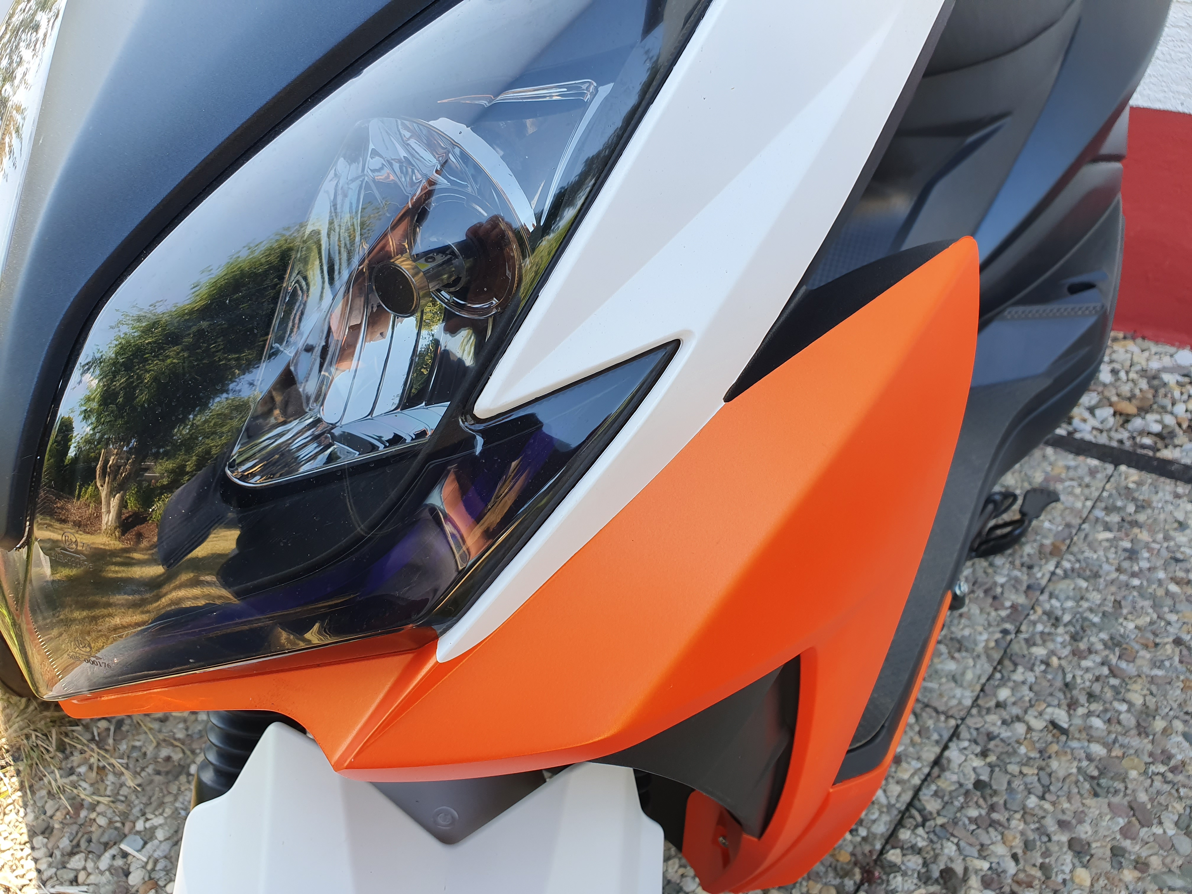 Der Roller verfügt über LED Beleuchtung bis auf die vorderen Blinker, warum auch immer das so ist. Das LED Abblendlicht ist soweit ganz gut aber das Fernlicht ist mir persönlich zu schwach. Es strahlt ein wenig nach oben aber man erkennt nicht wirklich einen großen Unterschied. Im Dunkeln in Kurven fahren ist nicht ganz ohne weil man eigentlich ins nichts fährt. Das Licht leuchtet leider nur starr geradeaus und bei engen Kurven sieht man rein gar nichts. Auch mit Fernlicht ändert sich da nichts weil es eben wie beschrieben nur nach oben leuchtet. Hier heißt es also schön langsam damit nichts passiert.