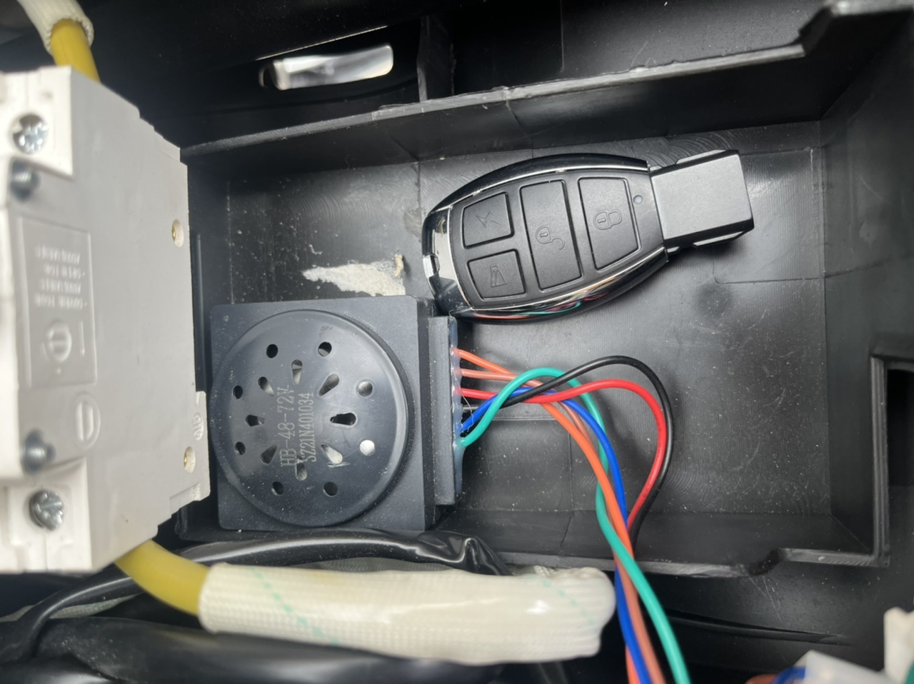 Hier gehen simpel 2 Kabel rein, sobald das Ding also Strom bekommt feuert es los. In unsere Boxen laufen deutlich mehr Kabel, also gehe ich davon aus, dass da auch noch mehr drin passiert also nur den Ton abzugeben. Aus meiner Box läuft auch noch die Antenne der Alarmanlage raus. Um das öffnen der Box wird man also wohl nicht herumkommen.