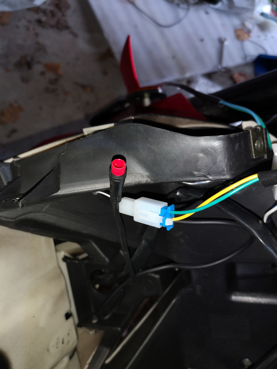 Das Kabel mit dem komischen DAYI-mini-Stecker hatte ich ohnehin schon so verlegt, dass es quasi wieder zurück in den kleinen Raum unterhalb der Cockpit-Platte gezeigt hat.