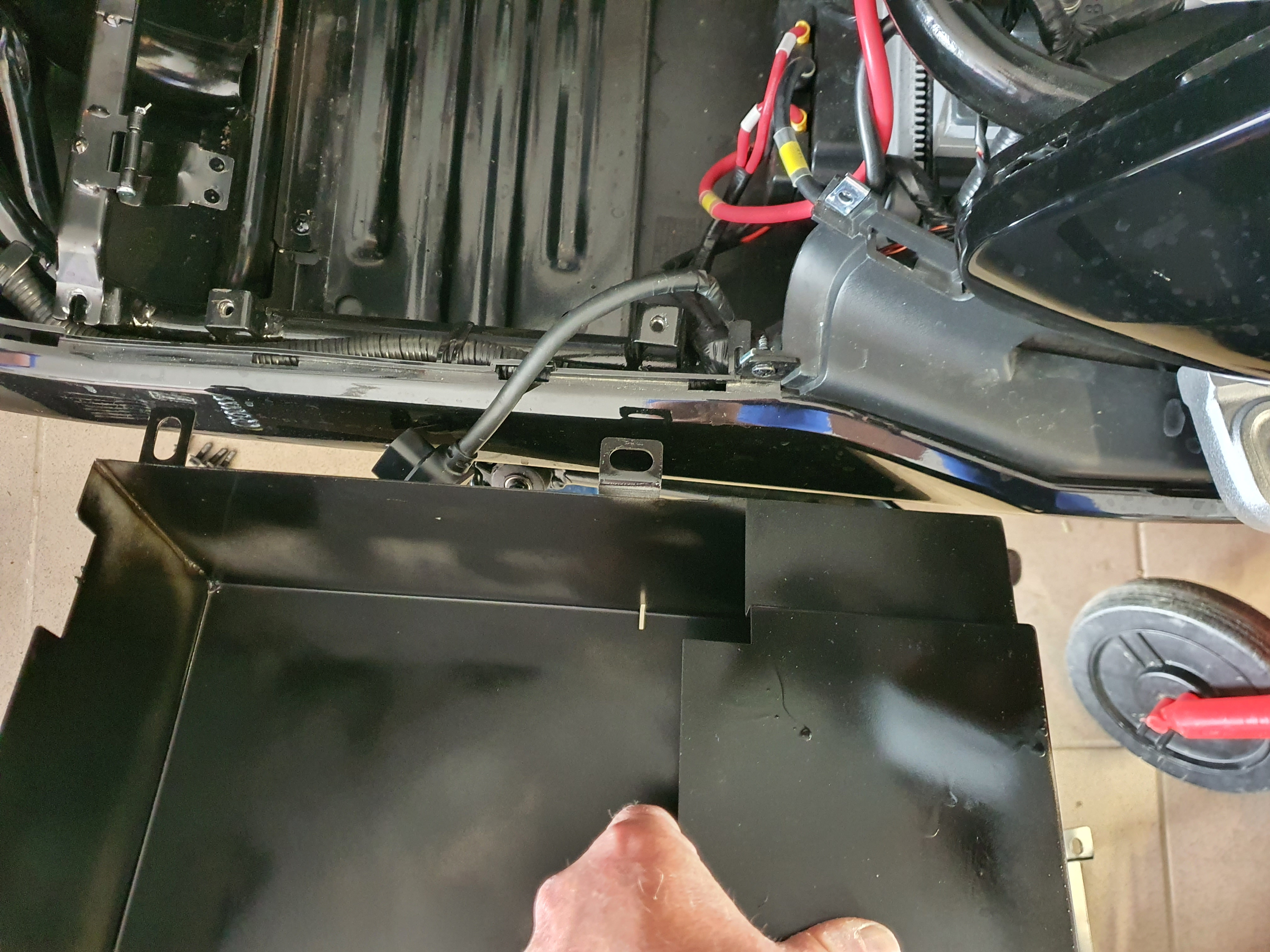 Hallo, die Verkleidungen sind kein Problem, erst die Abdeckung am Fussbereich, um die ganz wegzubekommen musst du die Scharniere noch lösen , das sind 4 extrem fest eingeklebte Kreuzschlitzschrauben, erst wenn der Akkudeckel weg ist kann man die Abdeckung des Fussraumes ausklinken. Aber,und das hat nirgendwo gestanden, man soll das Blech welches unter dem Kunstoff–Akkubehälter ist herausflexen? Das ist aber mit dem Rahmen verschweißt! Bin mir nicht sicher ob das keine stabilisierende Funktion hat. Also ich werde das lassen, die Idee ist gut, aber die Umsetzung ist sehr schlecht, es ist keine Anleitung dabei und der Controller mitsamt Kühlkörper muss versetzt werden, der Kühlkörper soll sogar nur zwischen Kunststoff und neuer Akkubox eingeklemmt werden. Das Bild hier hat mir Salvatore geschickt: