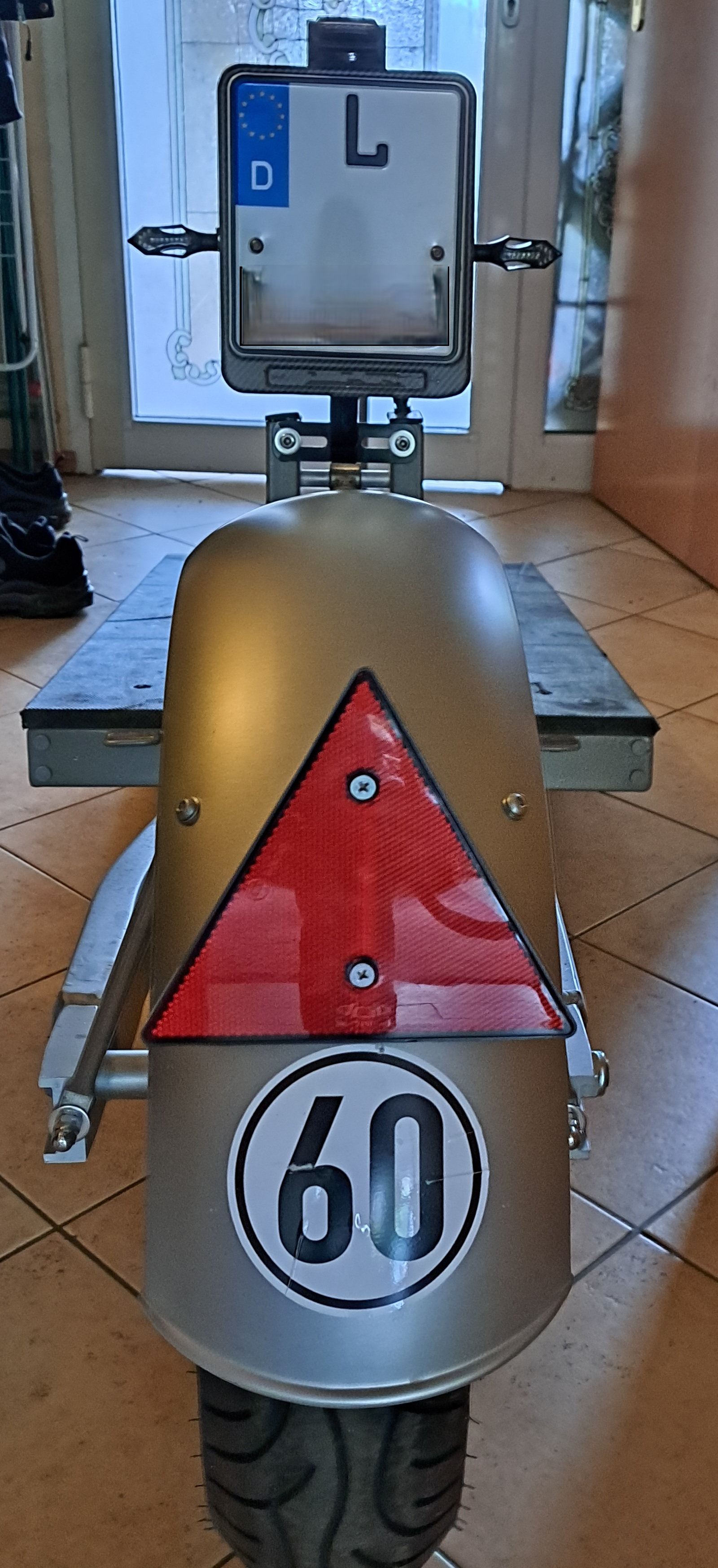 Hat ein Folge Kenzeichen und natürlich die komplette Beleuchtung mit Rücklicht, Bremslicht und Blinker und