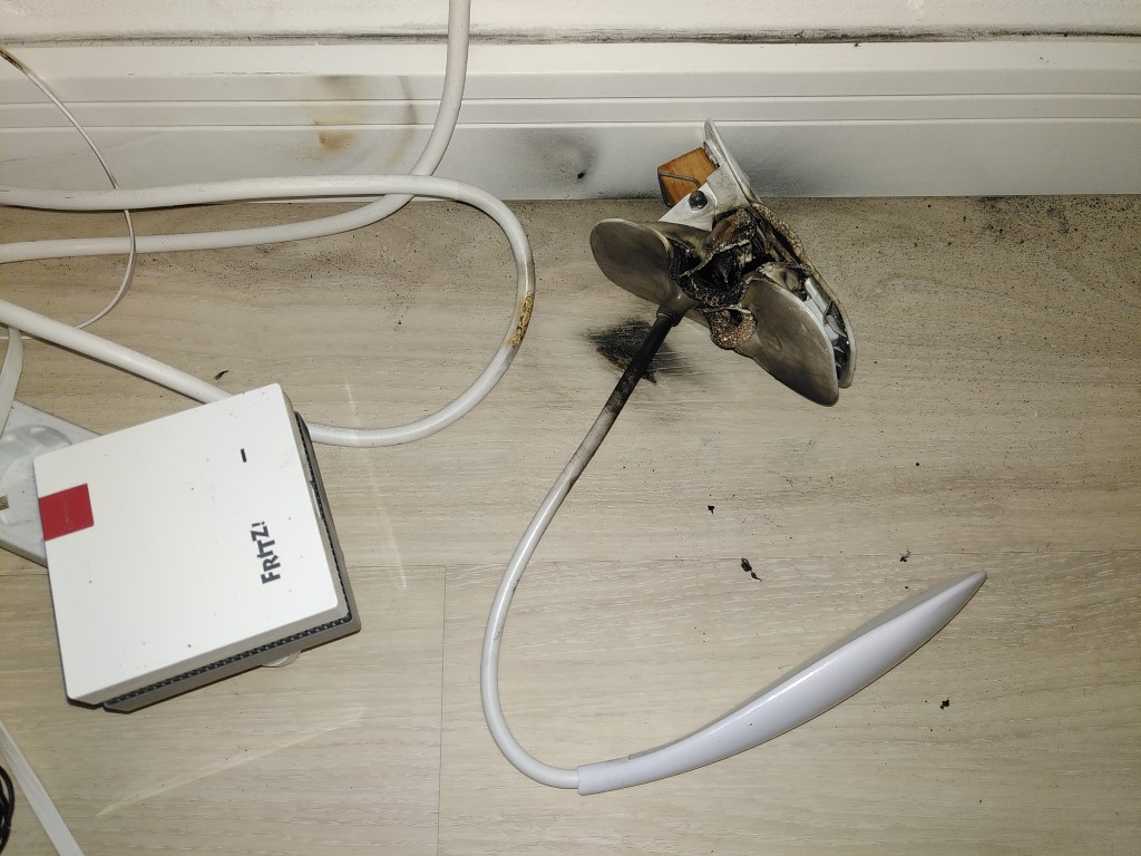 Zur allgemeinen Aufheiterung, auch wenn es kein Roller-Akku ist: Diese LED-Lampe mit einem Akku, der vermutlich 1/4 der Größe eines Handyakkus hatte, ist mir gestern Abend beim Aufladen in Flammen aufgegangen. Dabei wurde nur mit einfacher USB-Leistung (500mA) geladen. Plötzlich lodernde Stichflammen, das Plastik natürlich weggeschmolzen, und auch Boden+Wand gut angeschmaucht, den Fritz-Repeater muss ich mir noch näher ansehen.