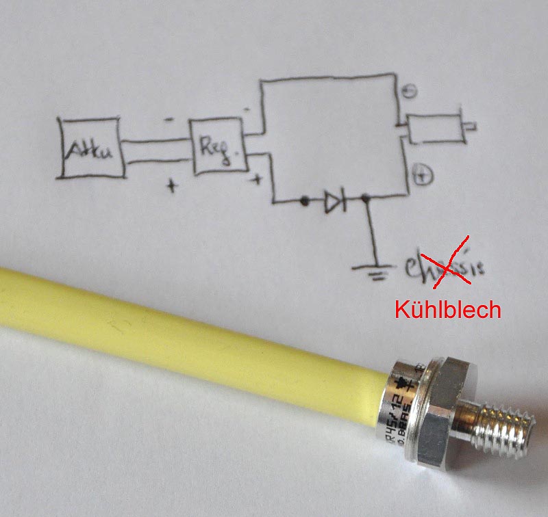 Somit habe ich mich entschieden ein vom Chassis isoliertes Kühlblech aussen am Roller zu montieren und den Pluspol der Diode damit zu verbinden (Schaltung wie am Bild)