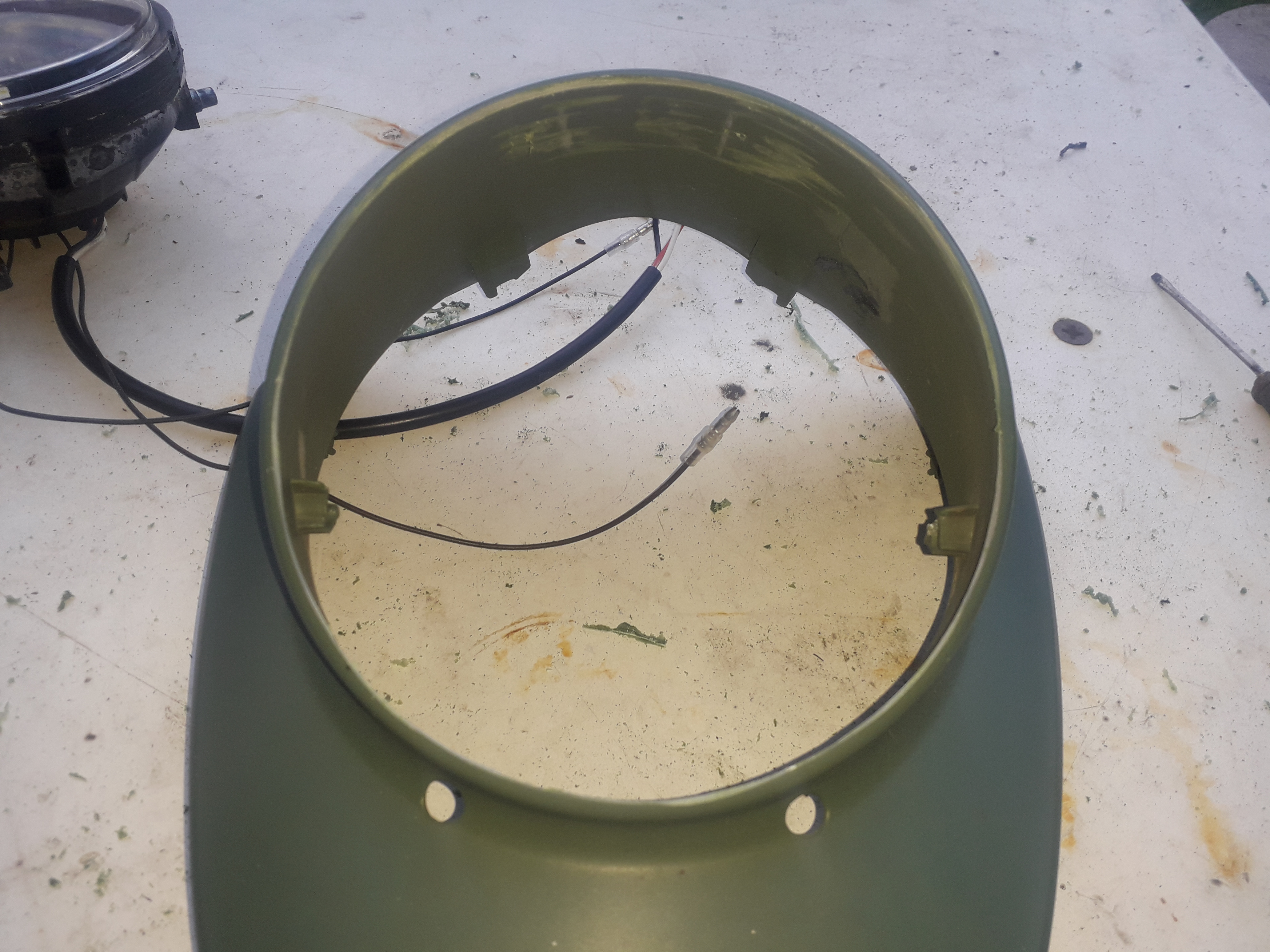 Der Rand rund um die Scheinwerferöffnung muß bis auf wenige mm weg.