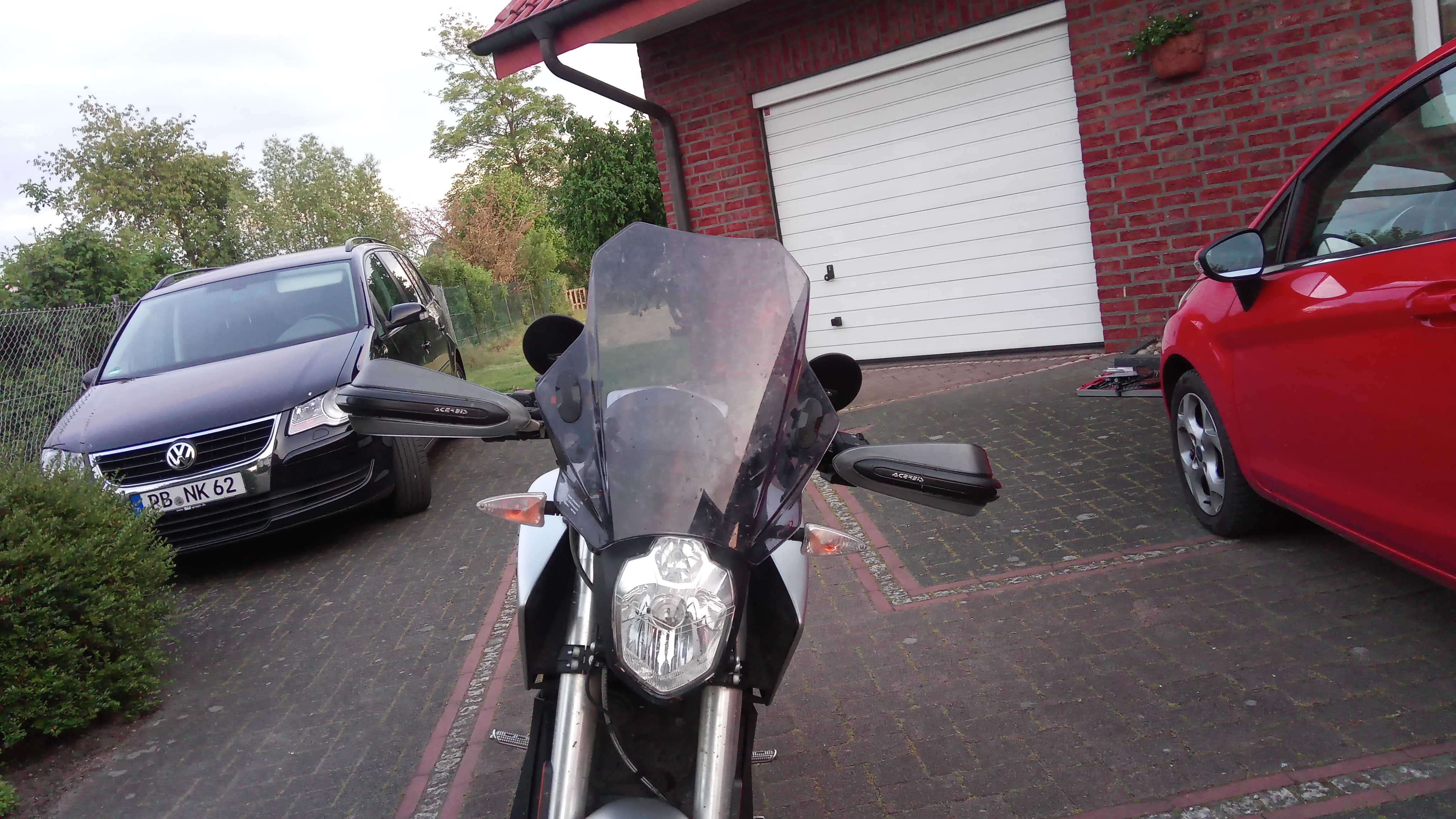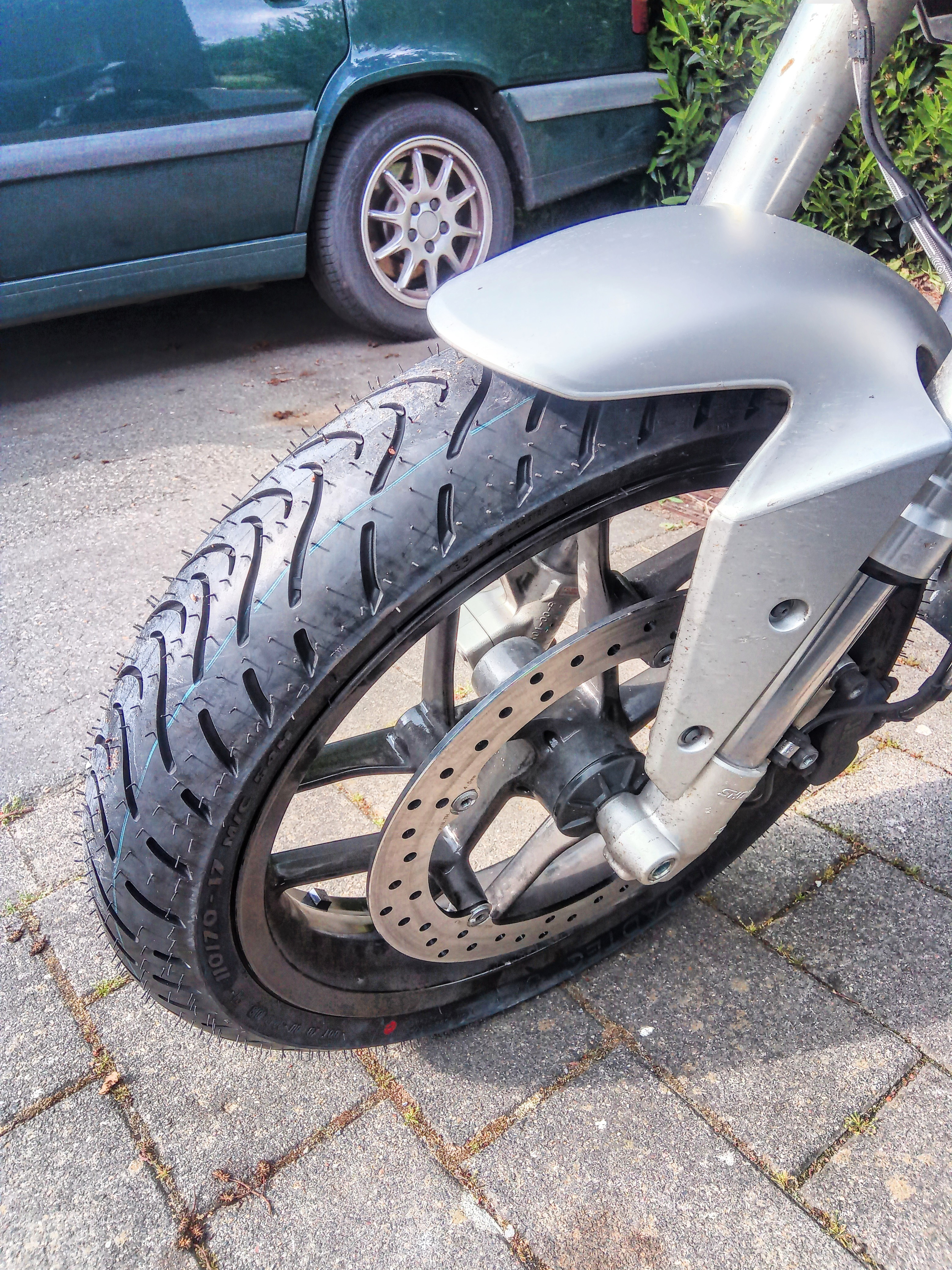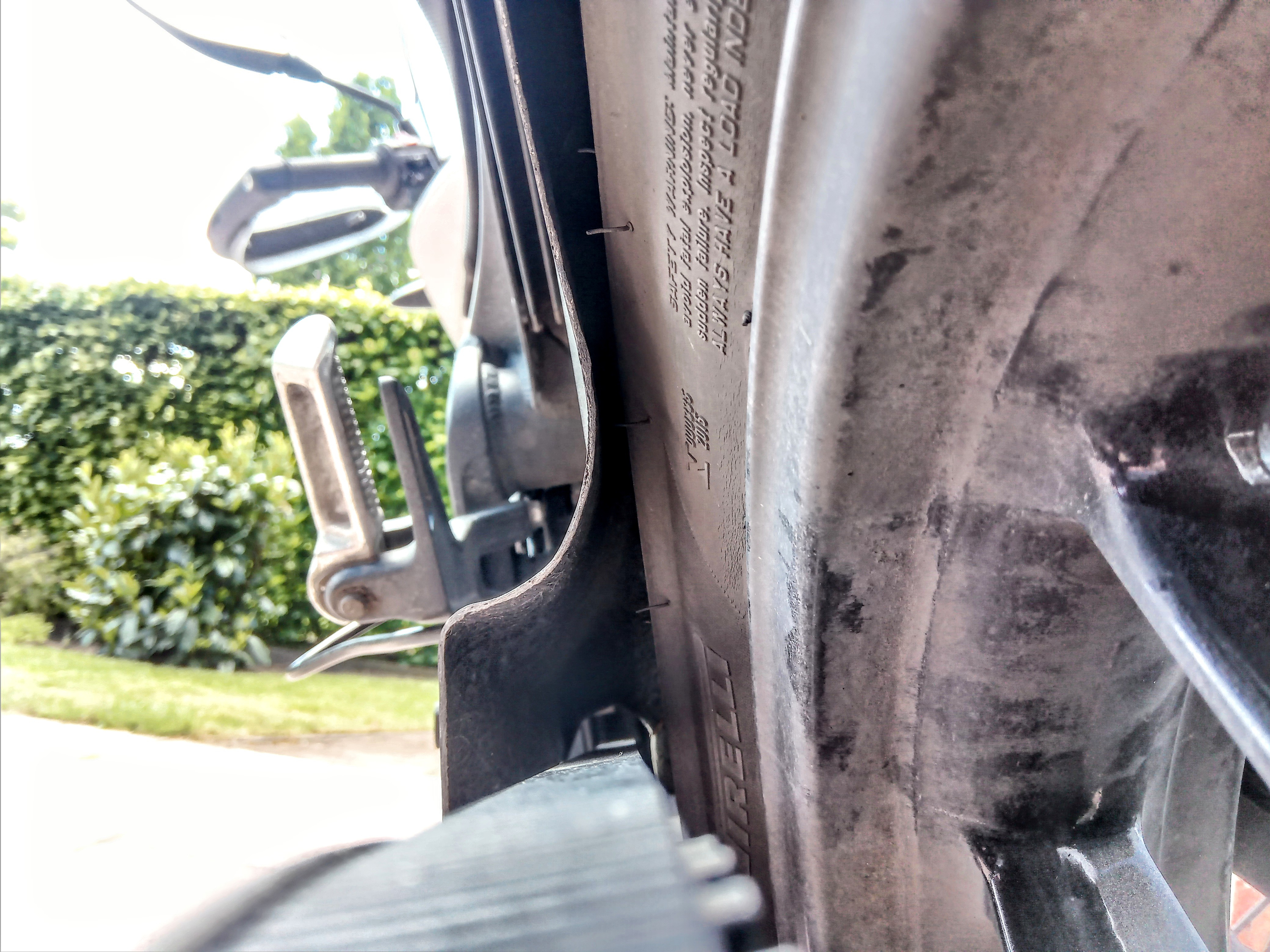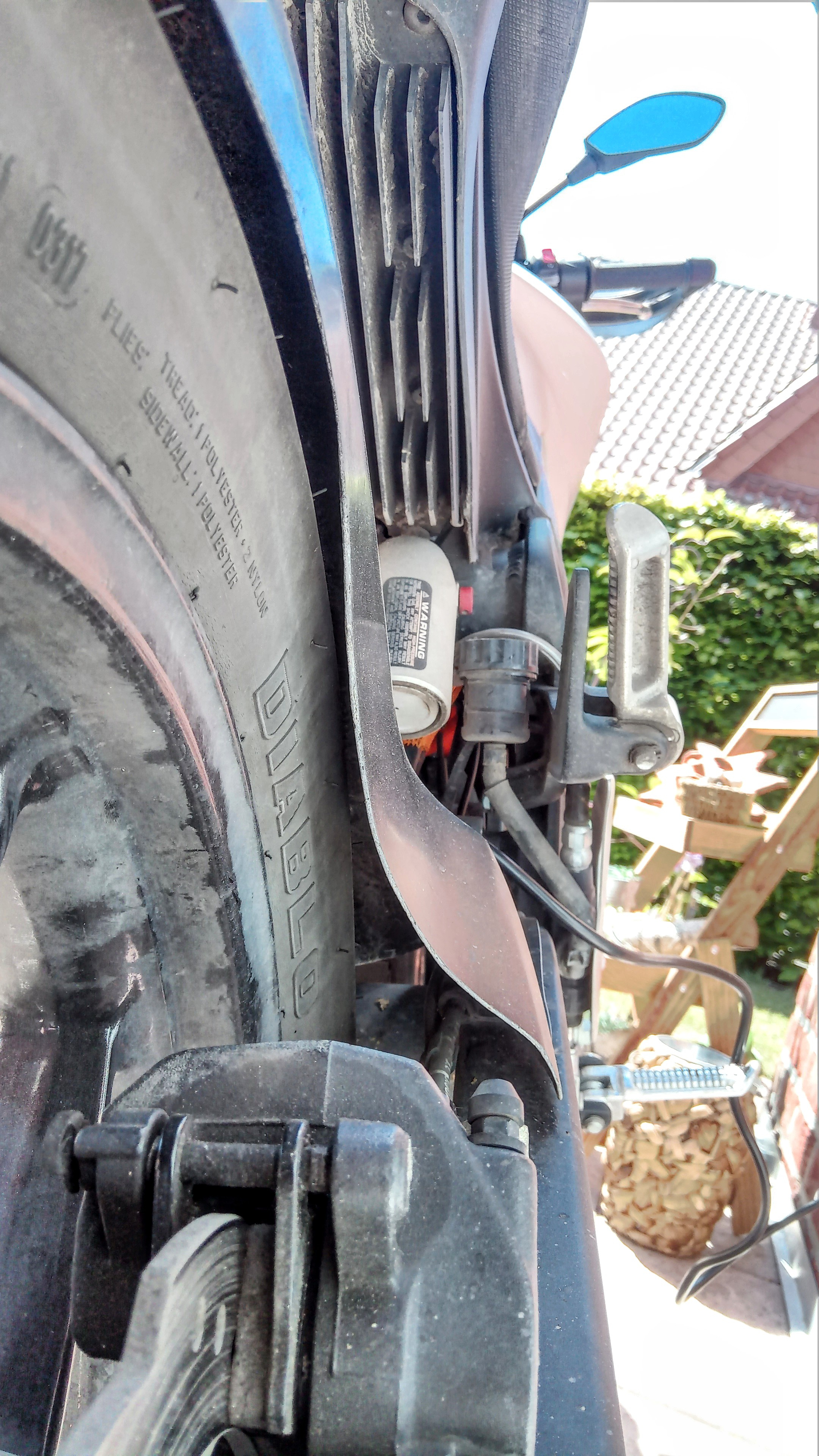 1. Erkenntnis: der nach hinten auskragende Spritzschutz schlägt bei Straßenschäden gern auf den Reifen. Vielleicht kann eine Edelstahl-Schlauchschelle links und rechts um die Swingenarme gespannt einem habhaften Draht-oder Alubügel ausreichend Halt geben, um das hintere Spritzschutzende abzustützen? Eine komplette 100% Kurzarbeitswoche eröffnet ganztägige Garagen-Zeitfenster