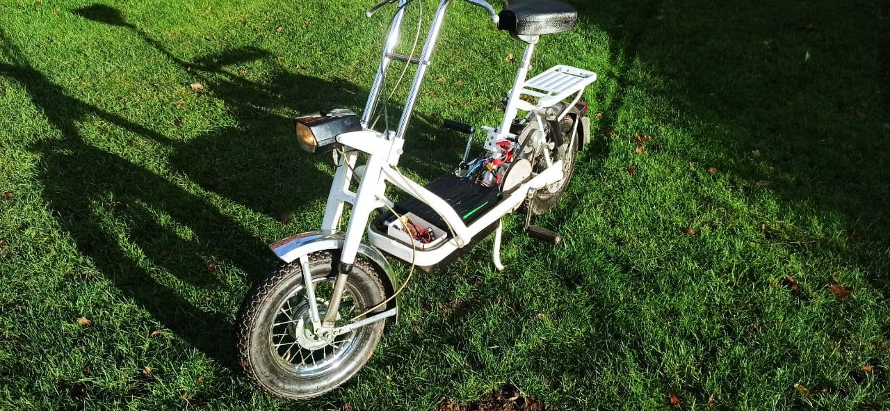 ich habe jetzt einen Radnabenmotor mit Regler, der recht klein baut, gekauft. Ist aber ein 10"er. Außerdem habe ich eine 9"-Vespa-Felge erstanden, die ist zweitelig und geschraubt. Ich denke dass ich die originale Felge vom Radnabenmoor abdrehen und Schraubenlöcher passend für die Vespa-Felge einbringen kann. Der Rest sollte dann ein Klacks sein, mal sehen was der TÜV-ingenieur meines Vertrauen dazu sagt (wenn die Pedale dann einfach in der Luft drehen...).