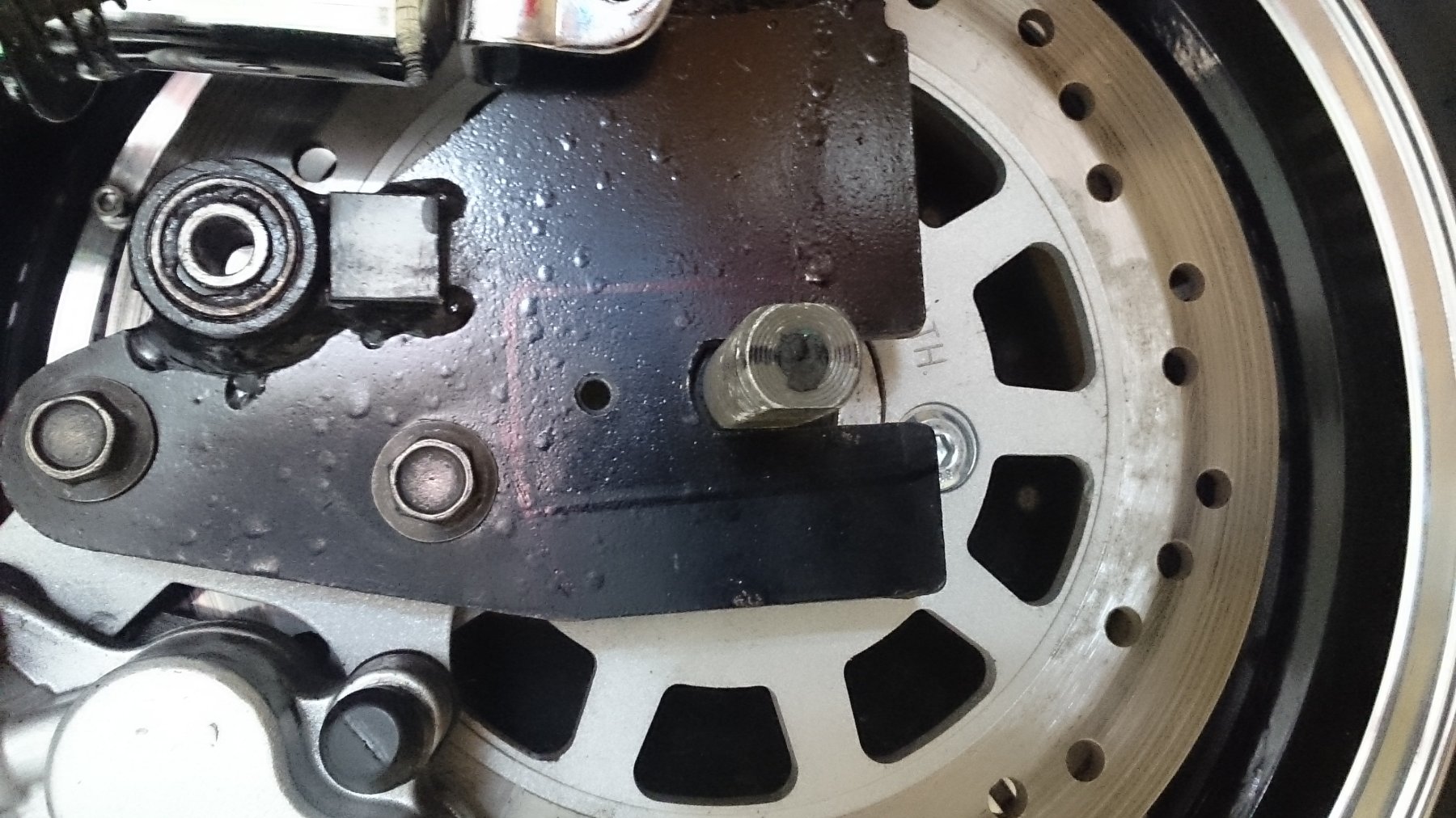 An der Drehmomentstütze habe ich etwas an der Ecke weg. Der Edding ist jetzt der innere Rand des Belages.