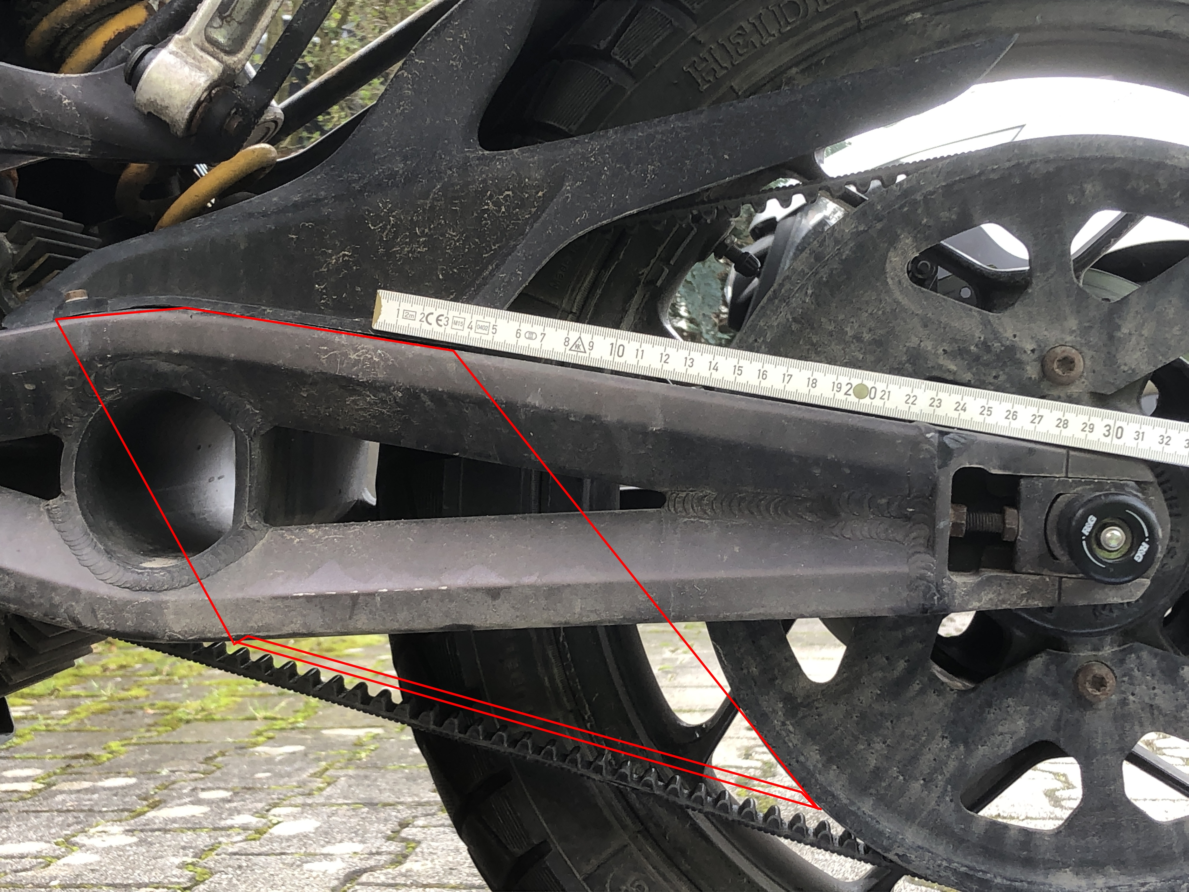 Habe gerade mal angefangen, die groben Maße eine Steinschutzes für den unteren Leertrum des Riemens zu ermitteln. Dann kommt das "CAD" zum Einsatz.