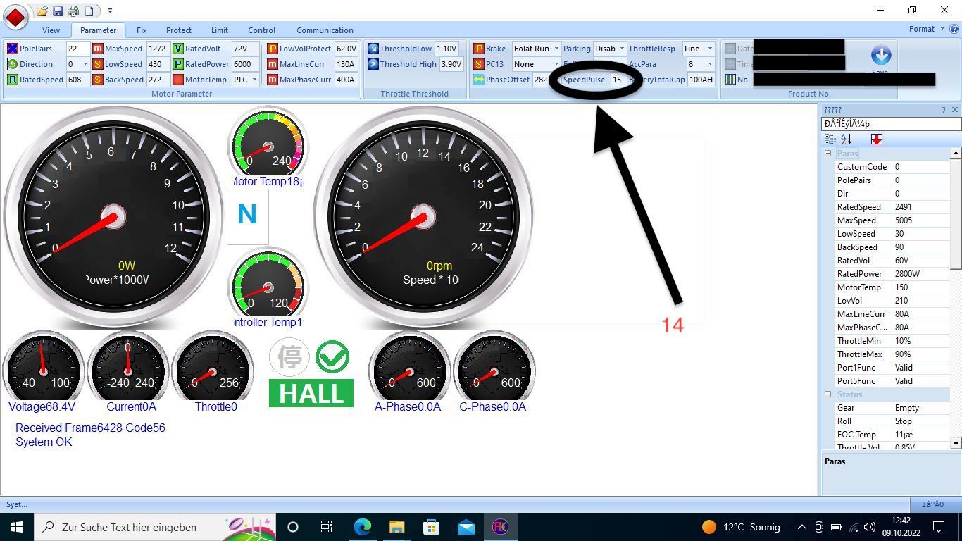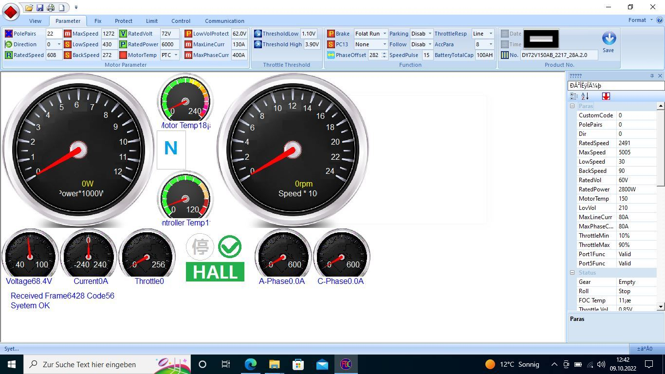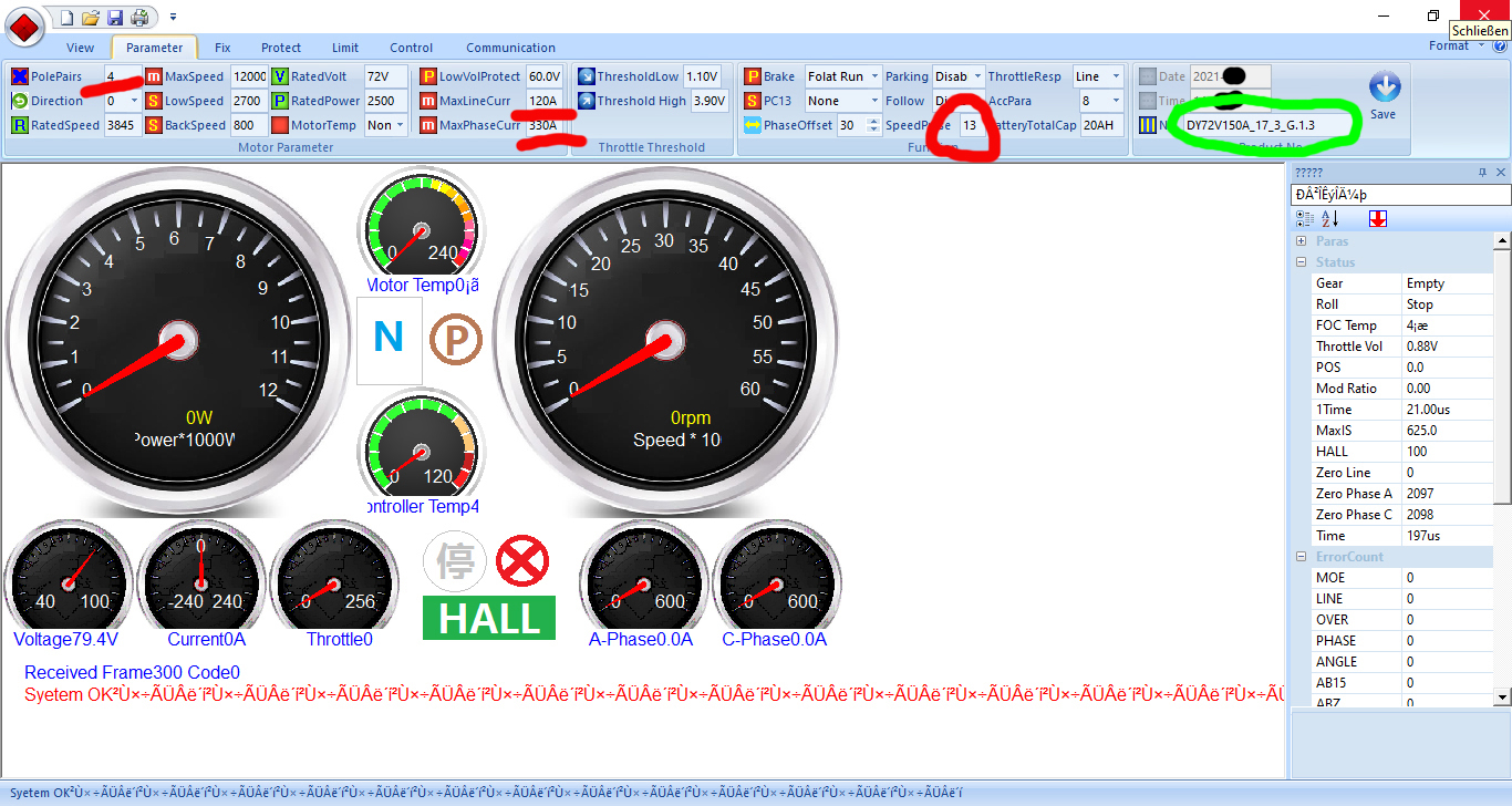 Mein Modell (Z-Odin, 100Ah, 6kW-Motor: DY1W726000 ohne PTC) hat den "normalen" Fardriver-Controller (DY72V150A_17_3_G.1.3), der leider mit einer Custom-Firmware für DAYI bestückt ist.