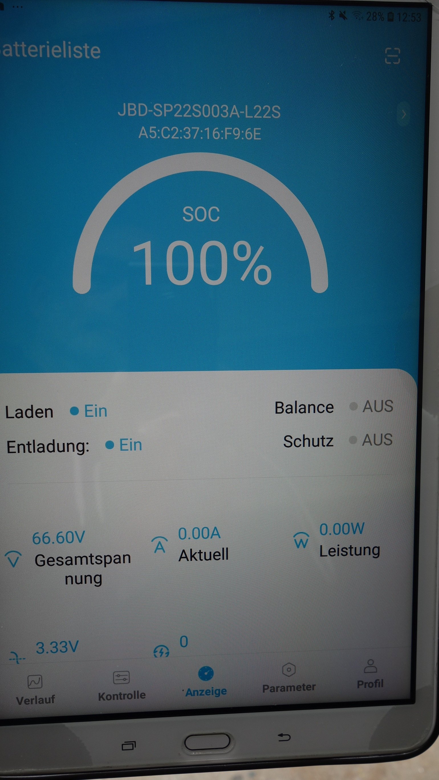 Nach dem Aufladen beträgt die Ladeendspannung jetzt 66,8 Volt. (Anzeige 100%) Die Ladespannung war 73V.