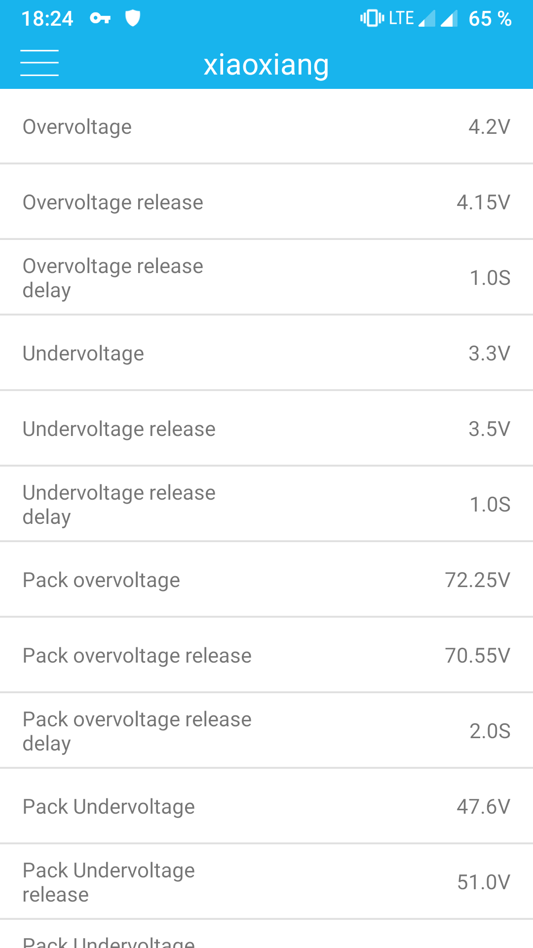 Das BMS habe ich wie unten konfiguriert und lade gerade, zur Sicherheit draussen :D Vllt. kann jemand sich auessern ob es so passt? Man kann nicht alle Parameter aendern, sondern nur die Spannungen (siehe letzter Screenshot). Der Akku darf gerne "konservativ" sein und frueh abschalten, da mir 45km reale Reichweite genuegen. Das Ladegeraet hat im Leerlauf 70.1V, d.h. 4.12V pro Zelle.