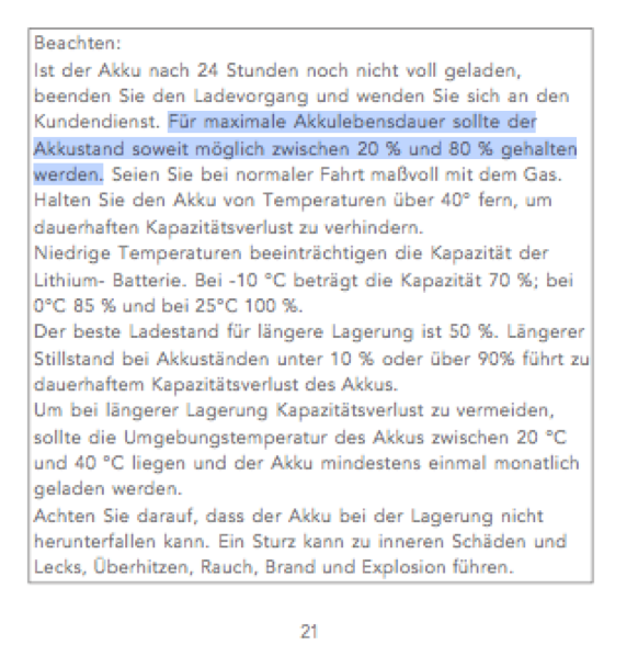 Weil hier ein paarmal die "20% => 80%" Ladestrategie in Frage gestellt wurde, vielleicht ein kleines Zitat aus dem offiziellen Niu N1S Handbuch (Modell 2018):