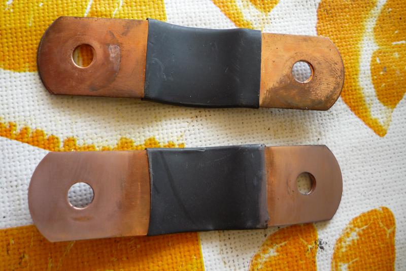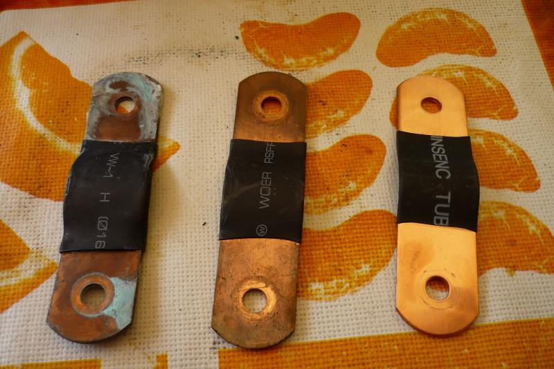 Dann werden die Zellverbinder aufgearbeitet, hier mal ein Foto: links der Verbinder an einer ausgesuppten Zelle, mitte ein gebrauchter, rechts nagelneu: Da der Gammel auch zwischen den Kupferlagen saß, wurden die schlimmsten Verbinder durch neue ersetzt. Die noch brauchbaren wurden an der Kontaktfläche zu den Zellpolen hin mit 1000er Schmirgelpapier bearbeitet: