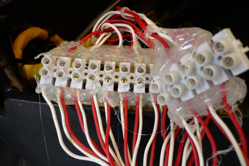 Dann den Tip von Alf beherzigt und die Kabel an den Lüsterklemmen mit reichlich Heißkleber fixiert: