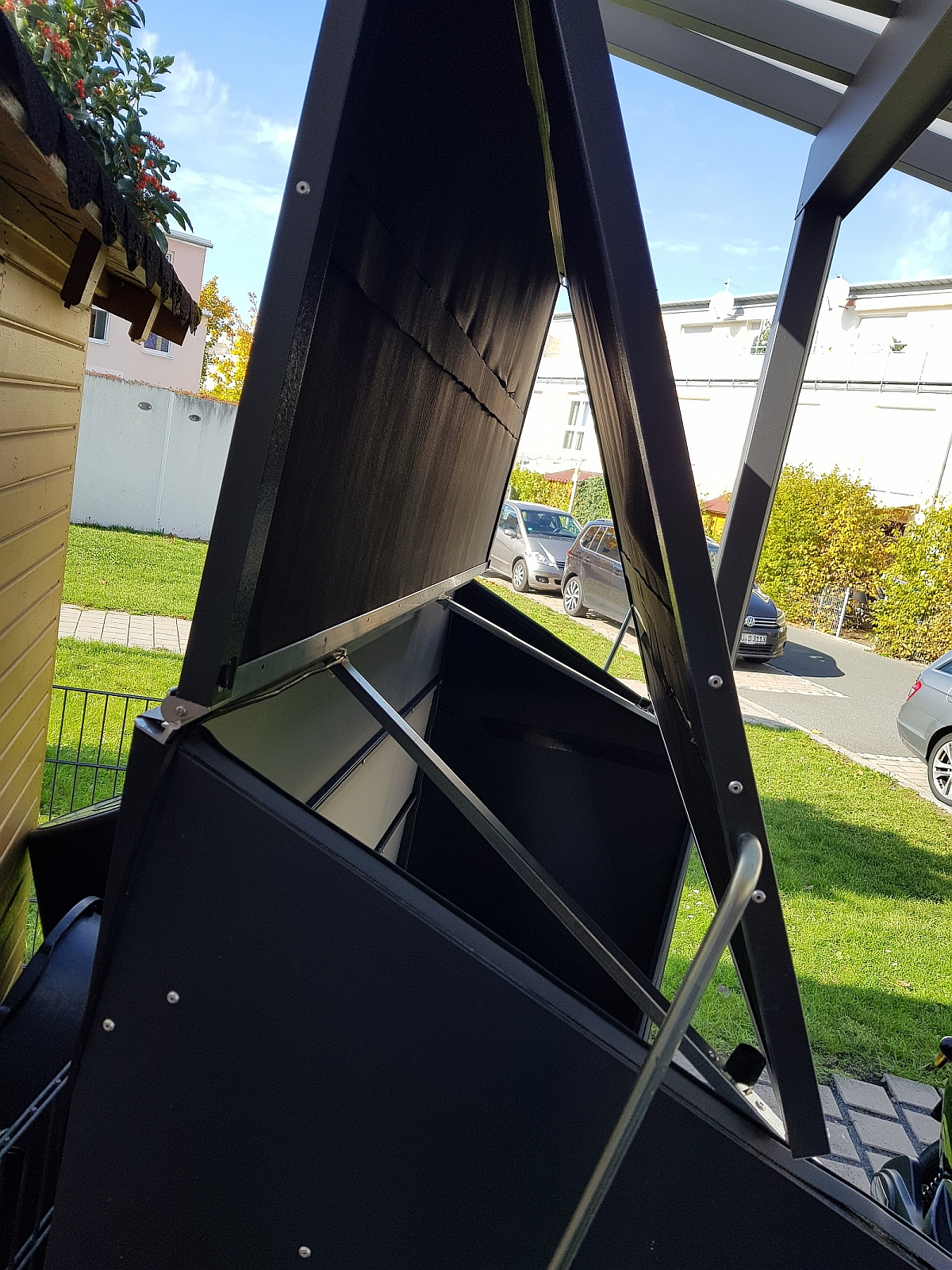 Die Aufbewahrungs-/Fahrradbox von TriMetals ist nun (fast vollständig) mit der Dämmung ausgekleidet - Nur für die Rückwand brauche ich noch eine andere Dicke des Dämmmaterials (13mm), da hier die "Verbindungsfalze" der einzelnen Rückwandteile nur 15 mm Luft bieten und ich lieber möglichst vollständig abdämmen will.