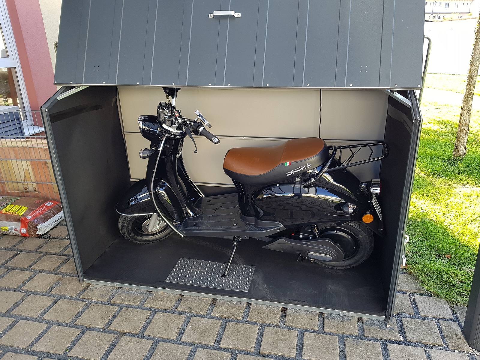 Ich habe mir diese Spiegel "Lovinn Seite Rückspiegel Paar 8 mm/10 mm Chrom Aluminium Legierung Motorrad Spiegel" (https://www.amazon.de/gp/product/B07FDB ... UTF8&psc=1) für 21,99 EUR hingeschraubt - nun kann der eRetro sicher in der Fahradbox (siehe Bild unten) überwintern... Die Box wird noch innen mit 19mm selbstklebender Dämmung (https://www.ebay.de/itm/Kautschuk-Platt ... 2749.l2649) ausgekleidet - damit es Innen nicht ganz so kalt werden kann. Denke mal das tut der Elektronik und den Akkus sicher gut, oder nicht?