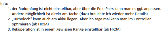 Das display bekommt die kmh Daten vom Controller gesendet. Es werden keine rpm oder Hallfrequenzen übertragen. Nur der reine kmh Wert. Es mag sein, dass die neuen Tachos hier einen linearen Korrekturwert einprogrammiert haben. Aber Fakt ist es kommt ersteinmal alles vom Controller.guewer hat geschrieben: Fr 5. Mai 2023, 00:49 ... Parametereinstellungen im TACHO tatsächlich die Geschwindigkeitsanzeige festgelegt wird und daraus die Genauigkeit der Enfernungsmessung resultiert. Es stimmt also, dass ein anderer Tacho (z.B. ein Neukauf bei Nova Motors) mit anderen einprogrammierten Werten den Geschwindigkeitsfehler behebt.