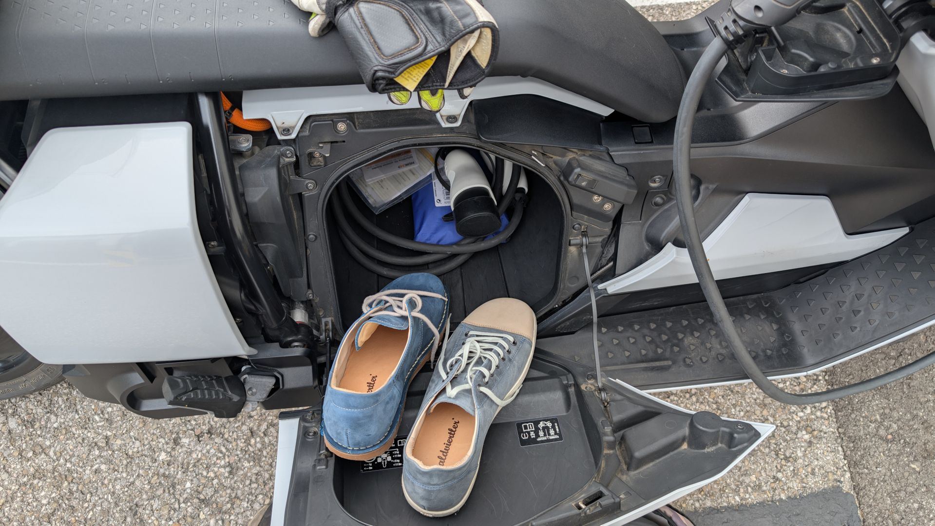 Also immerhin Fussschuhe habe ich bei der heutigen Tour besorgt, denn alles war total verschlissen. Ich latsche viel. Das ist ein bisschen friendly Schleichwerbung, weil ich die Firma mag (nur Endkunde, kein Business!) und die passen mir halt direkt, und weil der Shop in Ried leider dichtgemacht hat, gings heute über Kleinstrassen über den Hausruck nach Schwanenstadt, wo die Betreiberin des Shops mich gleich mal nach dem E Roller befragt hat, weil sie hat auch einen, und mich dann super cool beraten hat, und dann warens plötzlich nicht ein sondern zwei Paar Schuhe, die ich ins Gepäckfach gestopft habe. Hach