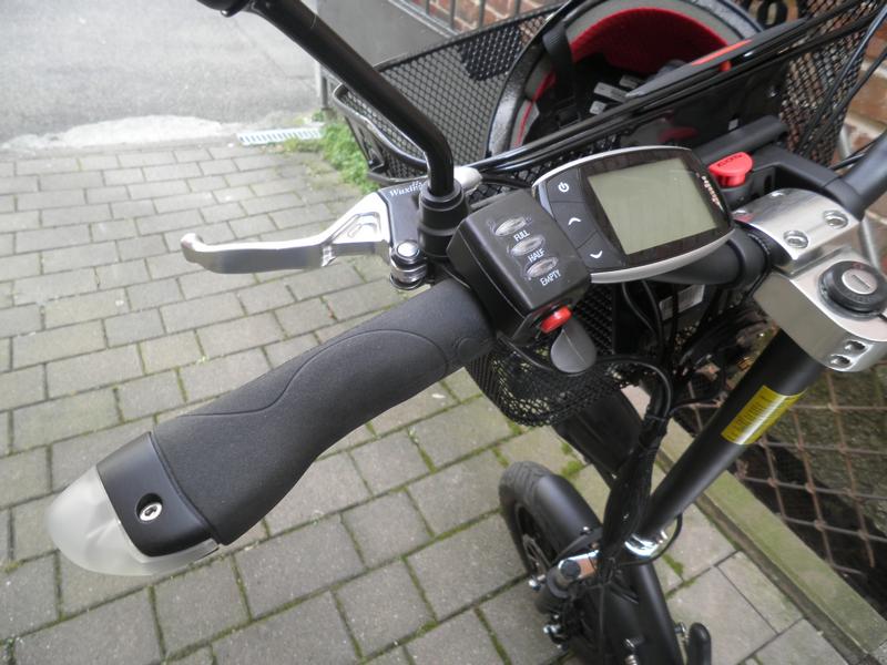 Dann noch Bilder des von mir umgestalteten Lenkers. Rechts und links die Blinkergrips, links nun der Daumengasgriff mit Akkuanzeige (auch 48V) und Tempomat. Der Schalter für Licht und Hupe ist dafür nach rechts gewandert.