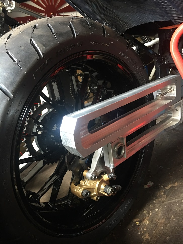 M2 Shocks vertreibt auch Öhlins-Dämpfer hat aber ein eigenes Model, extra für Drag Racing rausgebracht und jedes Federbein wird auf die Kiste angepasst und hergestellt.